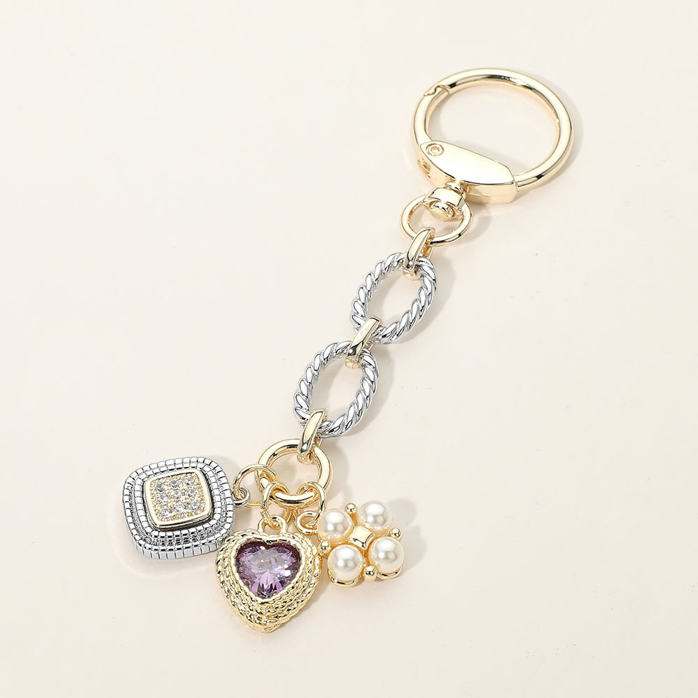 Details • Size : 4.5" L, 1.25" X 3.25" • This multi charm keychain features a heart motif, crystal-accented shapes, and pearl-inspired details suspended from linked chain elements for a layered, eye-catching look. Designed to add personality and shine to keys or bags, it’s ideal for boutiques seeking stylish, giftable accessories with everyday appeal. • CZ Cubic Zirconia • Gold Dipped