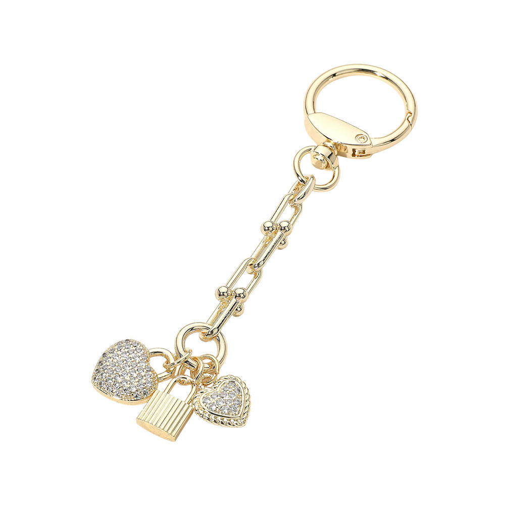 Details • Size : 4.8" L, 1" X 3.25" • This multi charm keychain features heart-shaped accents and a lock motif with crystal-style detailing, suspended from a sleek linked chain. Designed to add sparkle and playful meaning to keys or bags, it’s ideal for boutiques seeking romantic, giftable accessories that combine decorative charm with everyday functionality. • CZ Cubic Zirconia • Gold Dipped