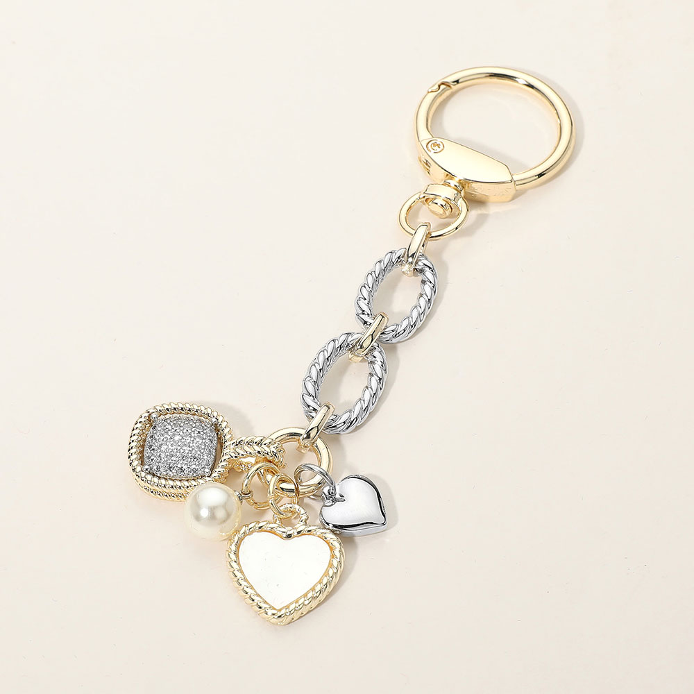 • This multi charm keychain features a pavĂ© square accent, heart charms, and a decorative bead suspended from a bold linked chain. Designed to add playful elegance to keys, handbags, or totes, it’s a versatile accessory ideal for gifting, everyday styling, and boutique collections seeking refined sparkle and charm-driven appeal.