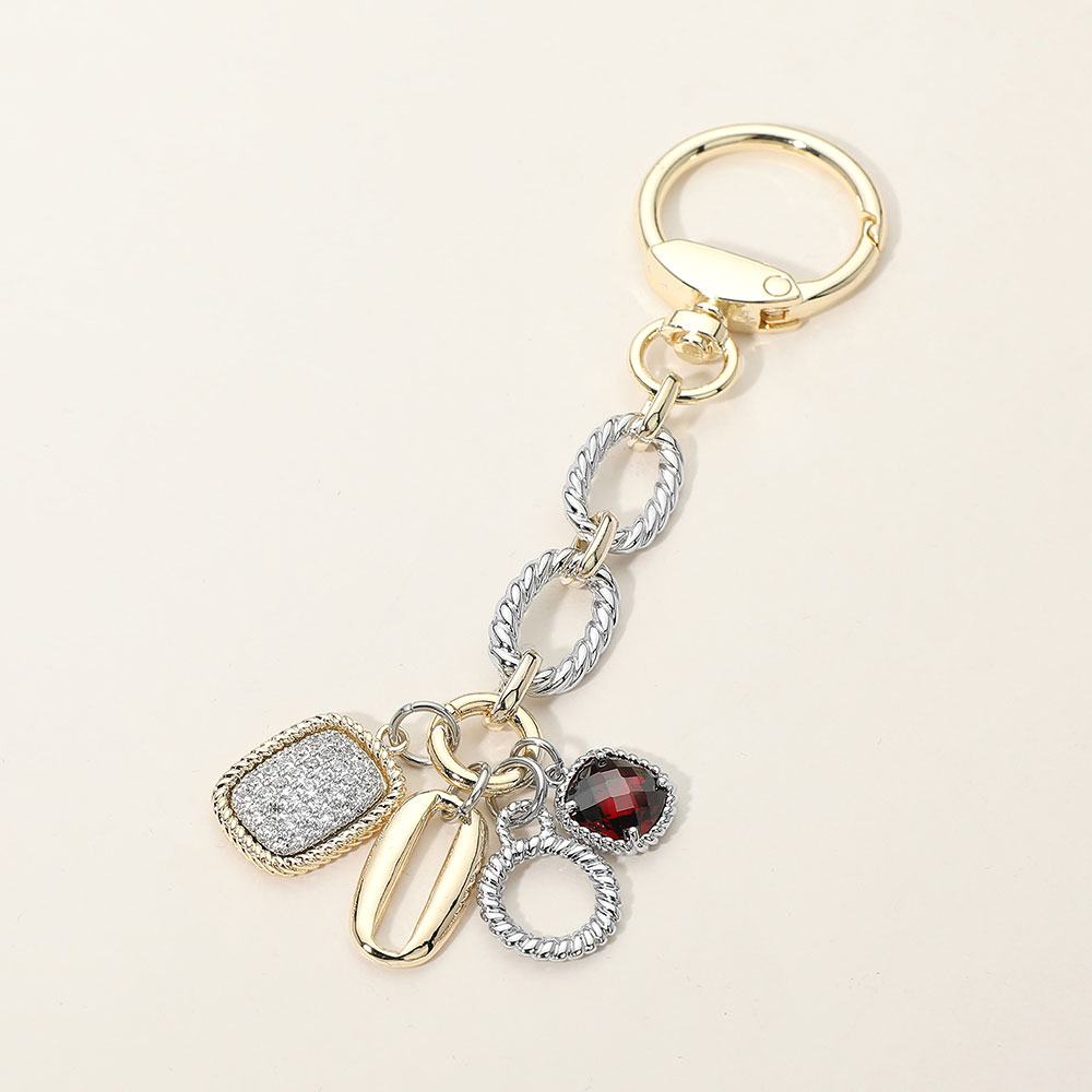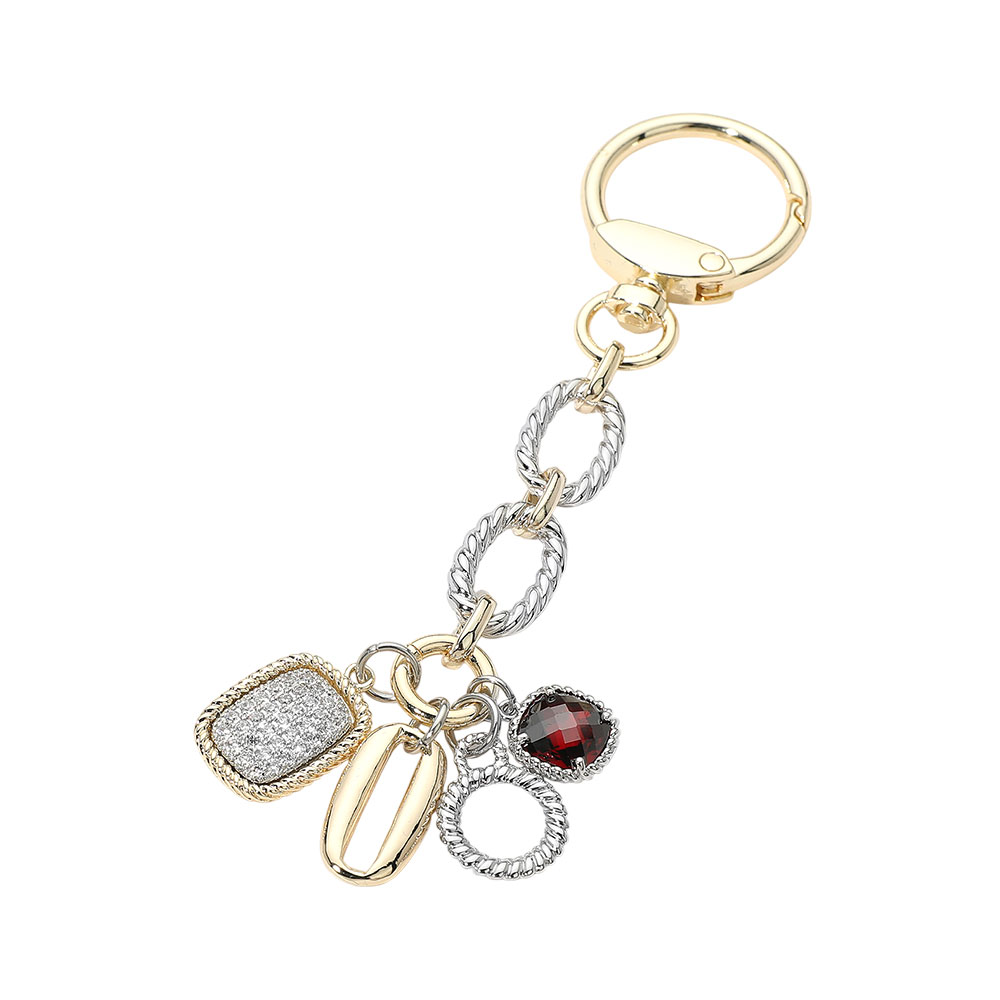 • This multi charm keychain features a mix of textured shapes and crystal-accented details suspended from linked rings for a layered statement look. Designed to add personality to keys or bags, it’s ideal for boutiques seeking stylish, giftable accessories that combine decorative flair with everyday functionality.