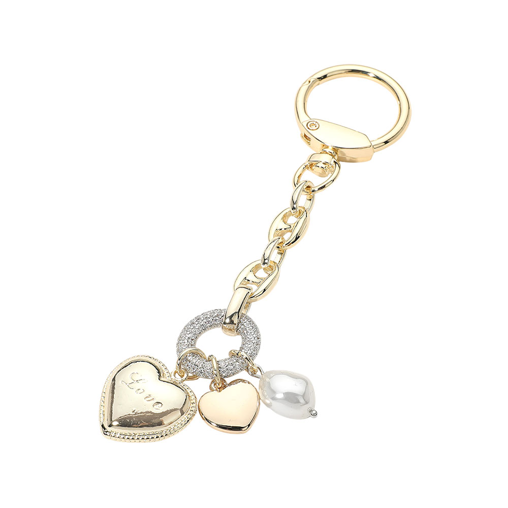 14K Gold Plated CZ Stone Paved Ring Accent LOVE Heart Pearl Charm Drop Keychain Bag Charm