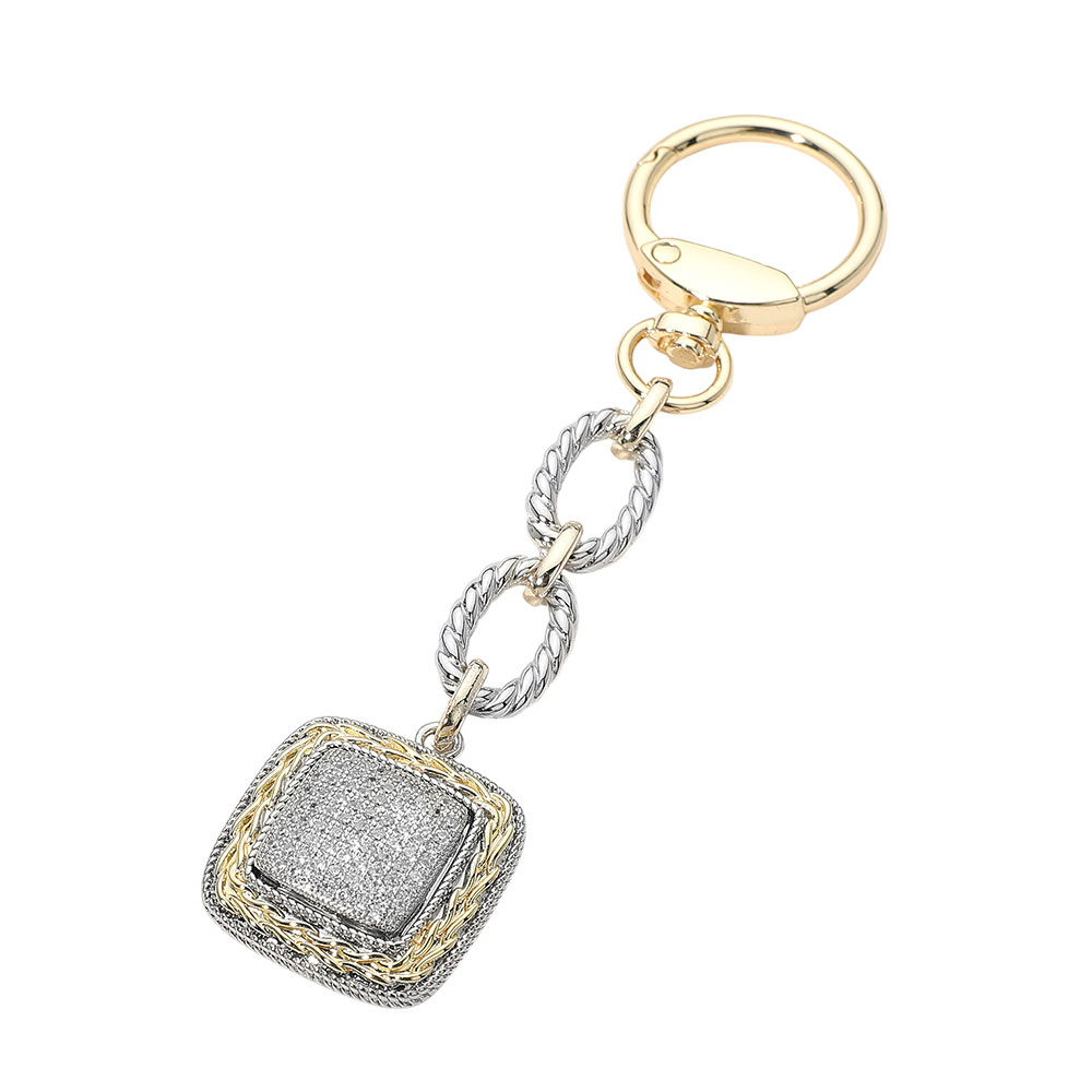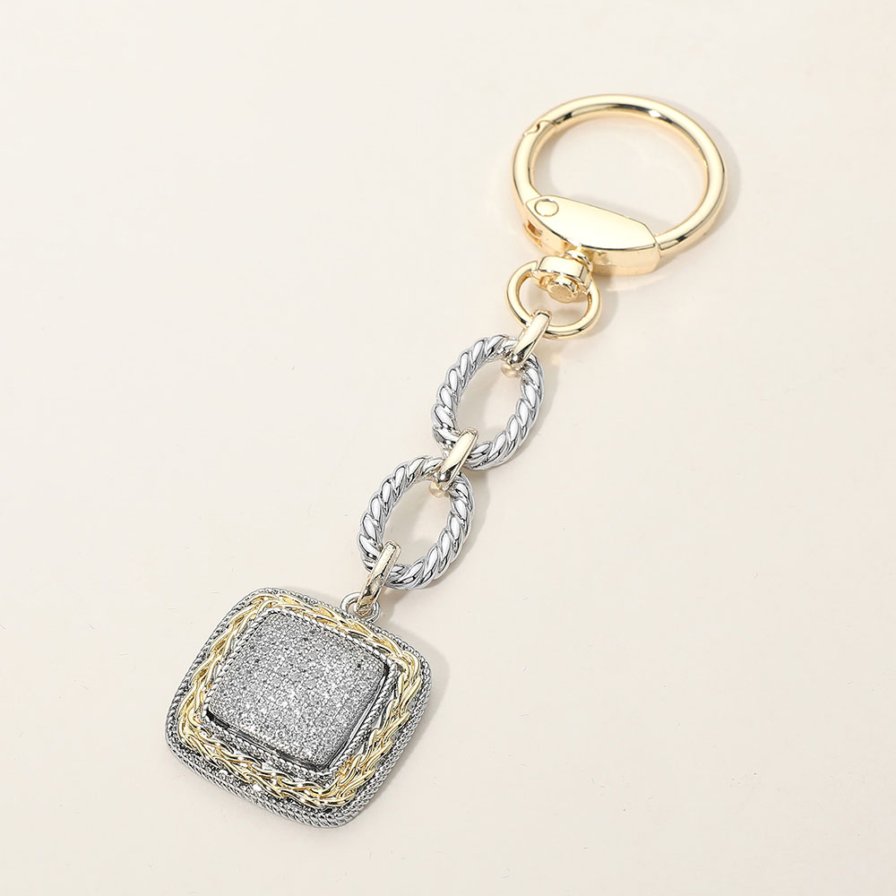 • This square pavĂ© charm keychain features a textured layered charm suspended from a bold linked chain for a modern, polished look. Designed to elevate keys, totes, or handbags, it’s a versatile accessory ideal for gifting, everyday use, and boutique assortments focused on refined sparkle and contemporary appeal.