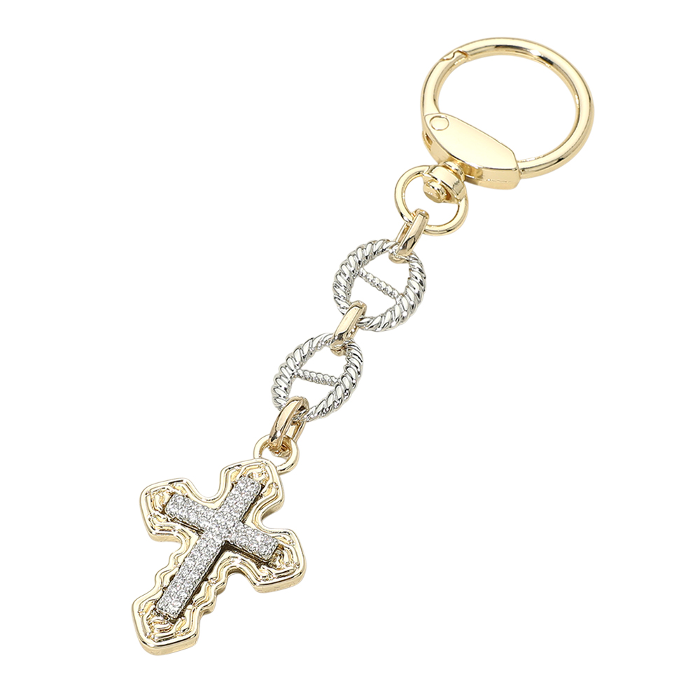 Details • Size : 5" L, 1.2" X 2" • Stylish charm keychain featuring a crystal-accented cross design paired with textured link details and a secure key ring. Created to add a meaningful decorative touch to keys, bags, or accessories, this elegant piece works well as a thoughtful gift, boutique accessory, or everyday statement with timeless appeal. • CZ Cubic Zirconia • Gold Dipped