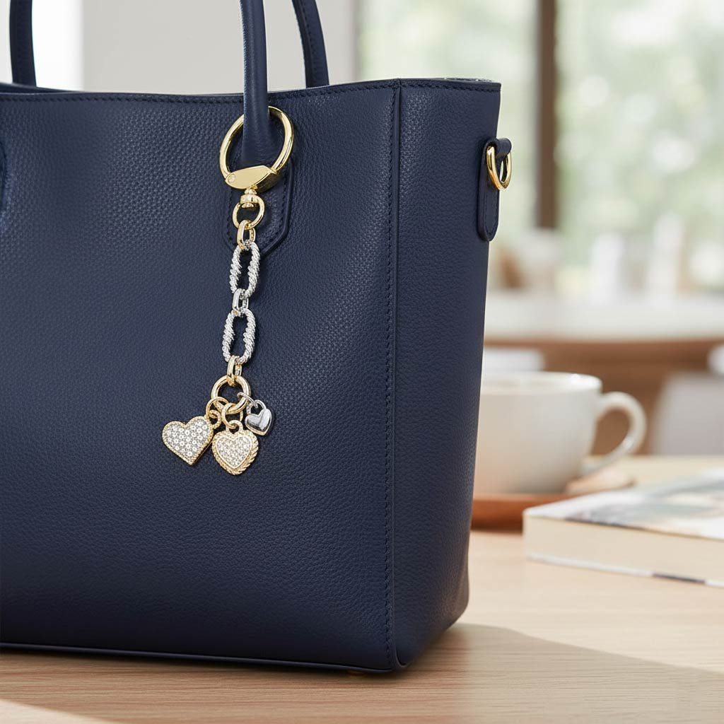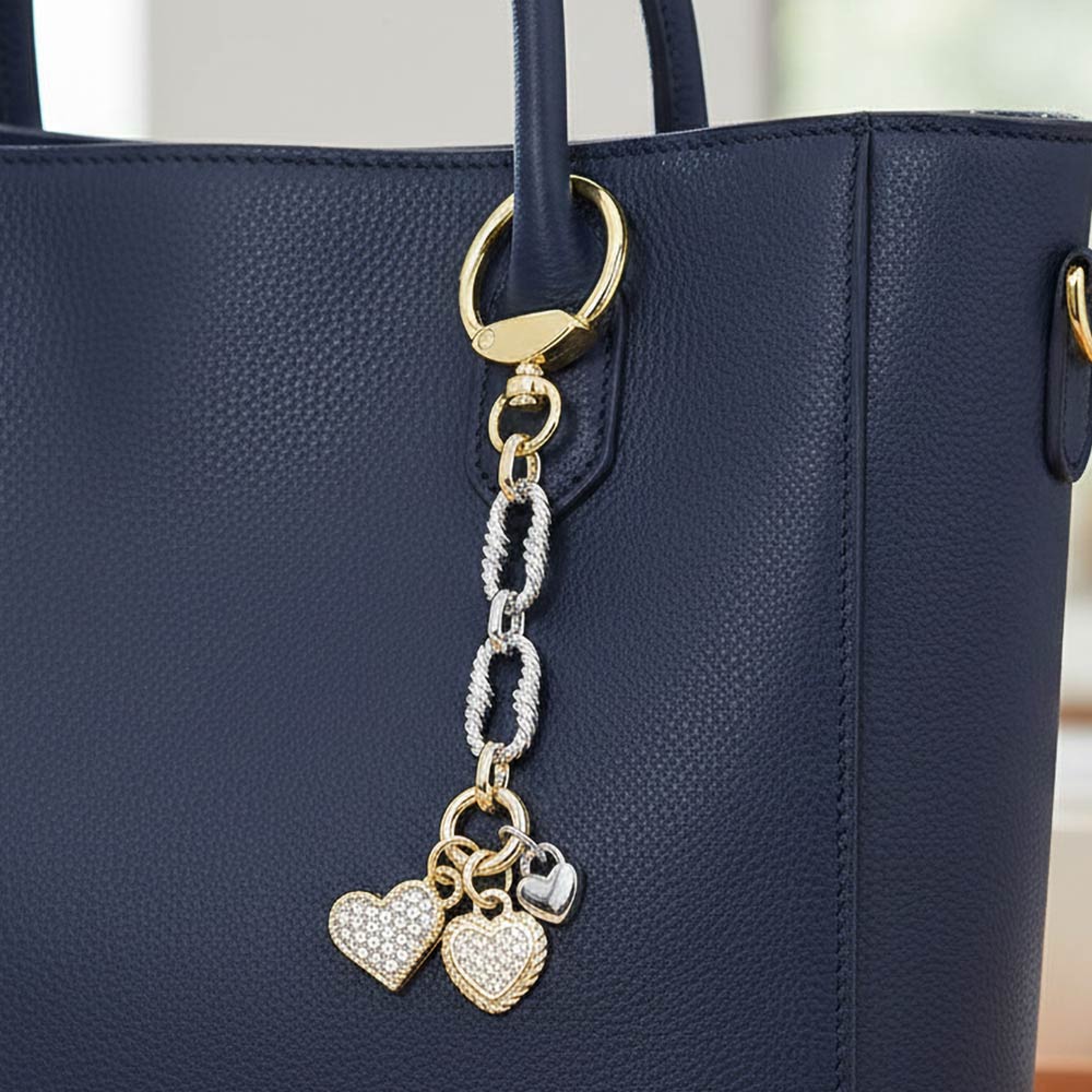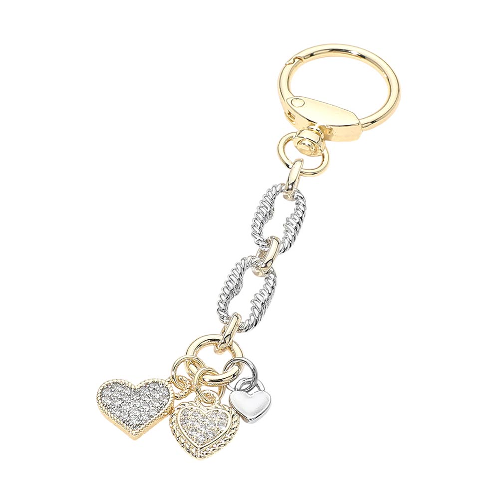 Details • Size : 5" L, 0.8" X 3.3" • This elegant multi heart charm keychain features layered heart accents with sparkling crystal details and a stylish chain link design. Created to add charm and personality to keys, handbags, or accessories, it blends decorative appeal with everyday practicality. A versatile accessory ideal for gifting, boutique collections, or seasonal displays, offering a timeless romantic touch that complements a wide range of styles. • CZ Cubic Zirconia • Gold Dipped