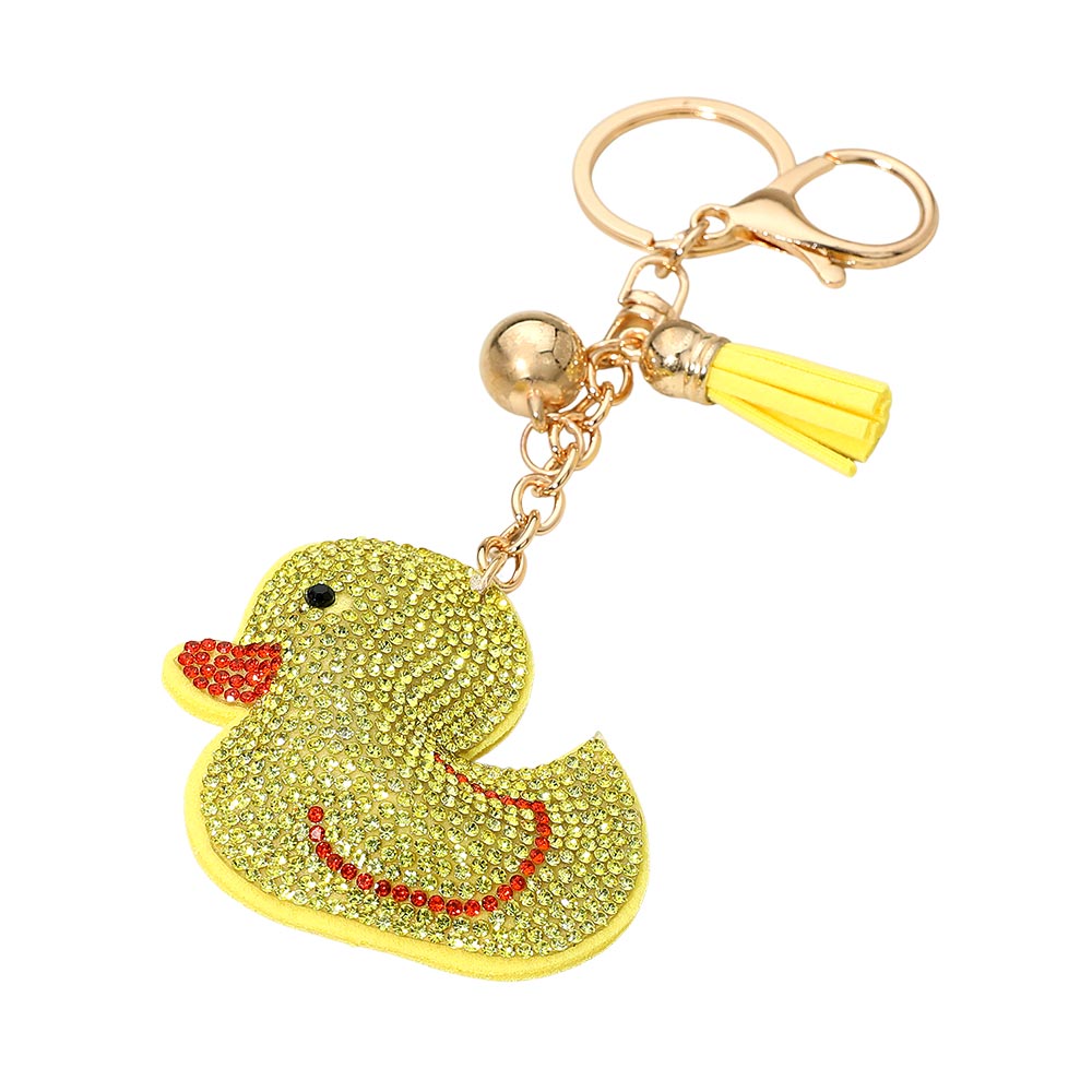 Details • Size : 2.5" X 2.5", 6.25" L • Cute duck-shaped keychain covered in sparkling rhinestones with a tassel charm for added flair. A fun and playful accessory to personalize your keys, handbag, or backpack. Makes a charming and cheerful gift for anyone who loves unique and glittery keychains. • Lead and Nickel Compliant
