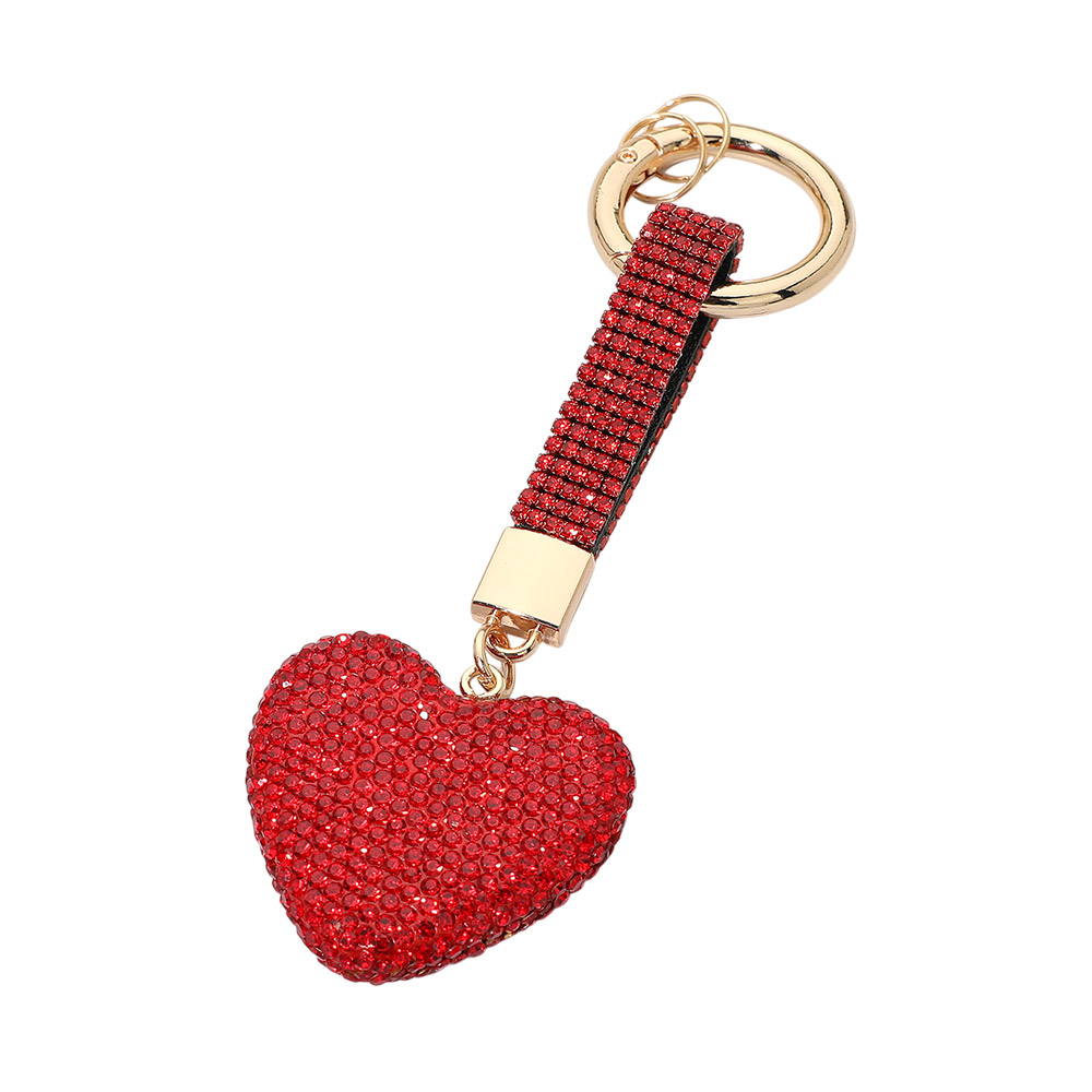 Details • Size : 5.3" L, 1.8" X 3.8" • Heart-shaped rhinestone keychain designed to add a bold, stylish accent to keys, handbags, backpacks, and accessories. Features a sparkling charm with a sleek strap detail, making it ideal for boutiques, gifts, party favors, and trendy everyday add-ons customers love. • Lead and Nickel Compliant
