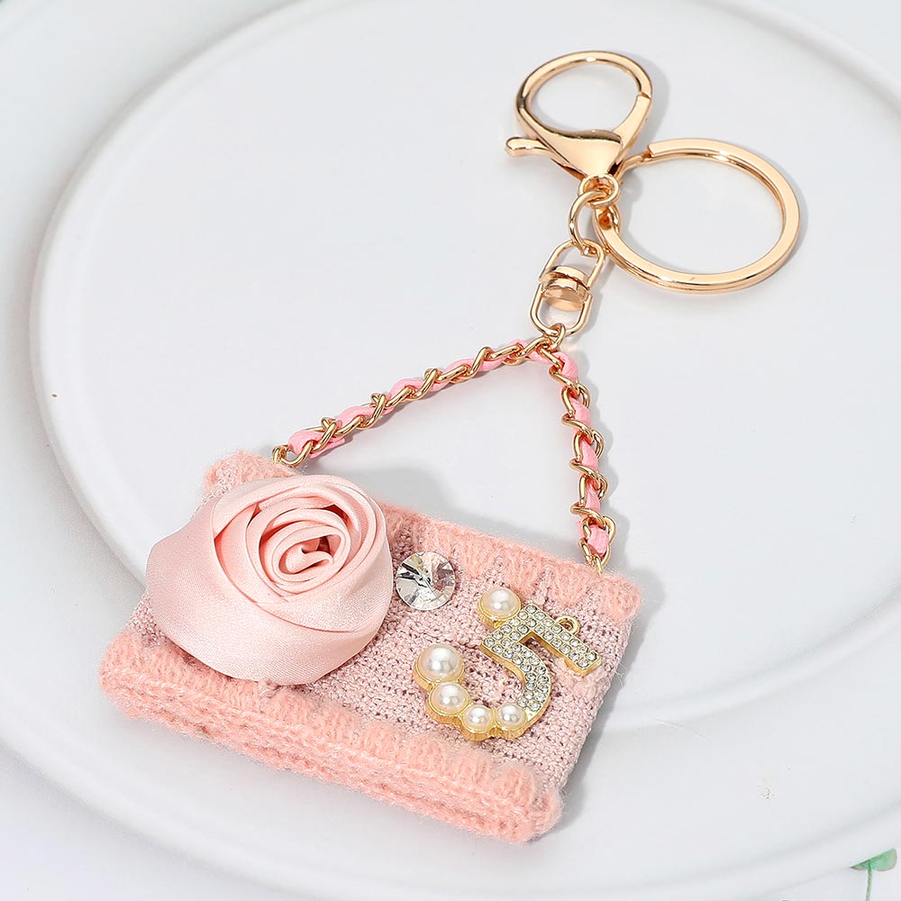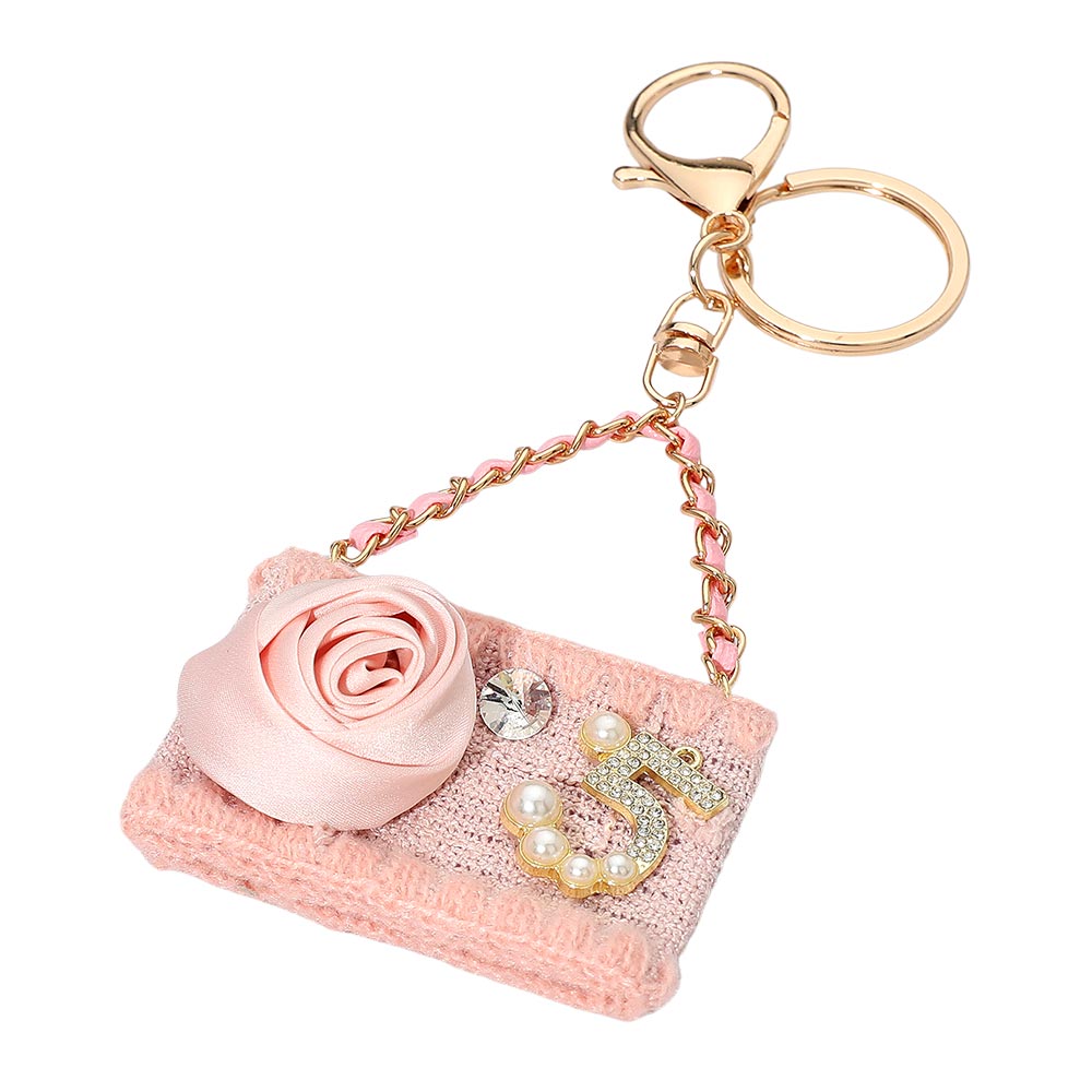 Fabric Flower Pearl Paved Number Five Embellished Handbag Keychain / Bag Charm