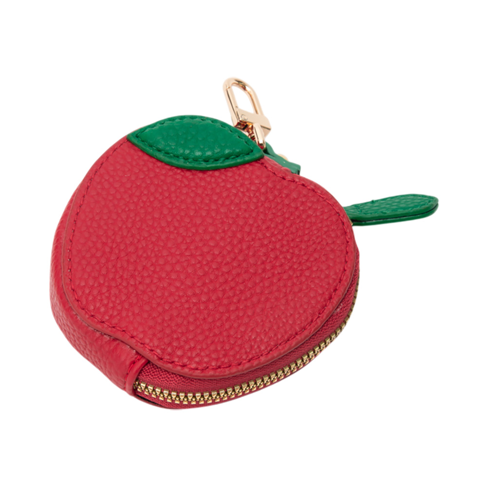 • Apple-shaped keychain pouch crafted from textured faux leather, featuring a secure zipper closure and gold-tone clasp—ideal for carrying coins or small essentials in style.
