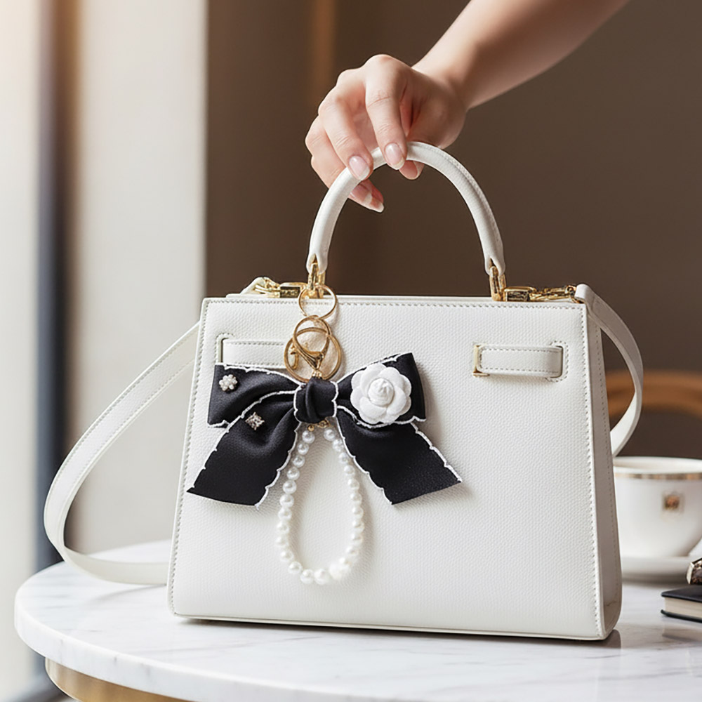 Flower Rhinestone Accent Pearl Loop Bow Keychain Bag Charm
