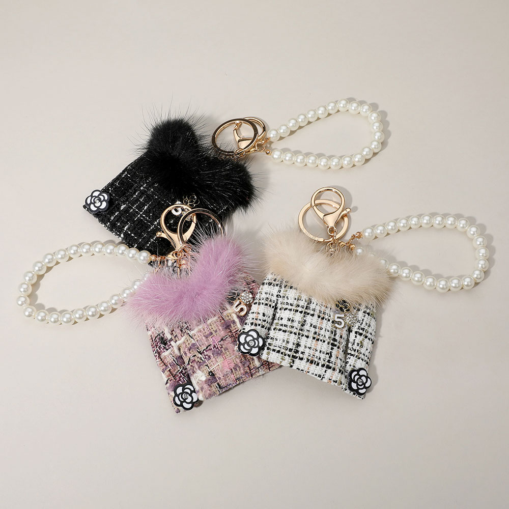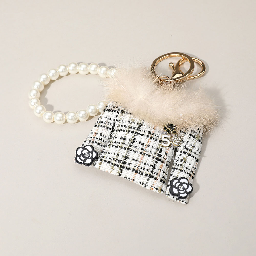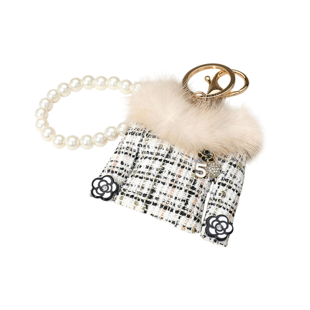 Fuzzy Neck Flower Cuff Tweed Jacket Pearl Chain Bag Charm / Keychain