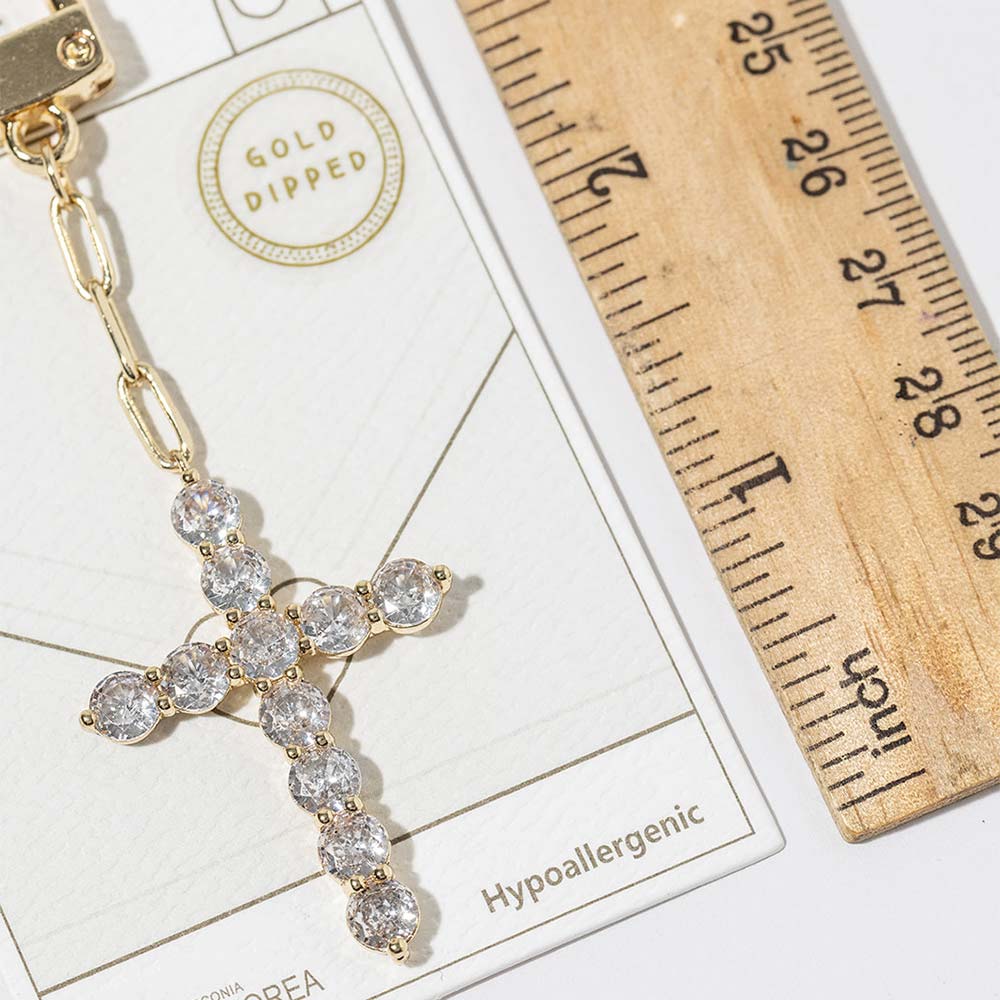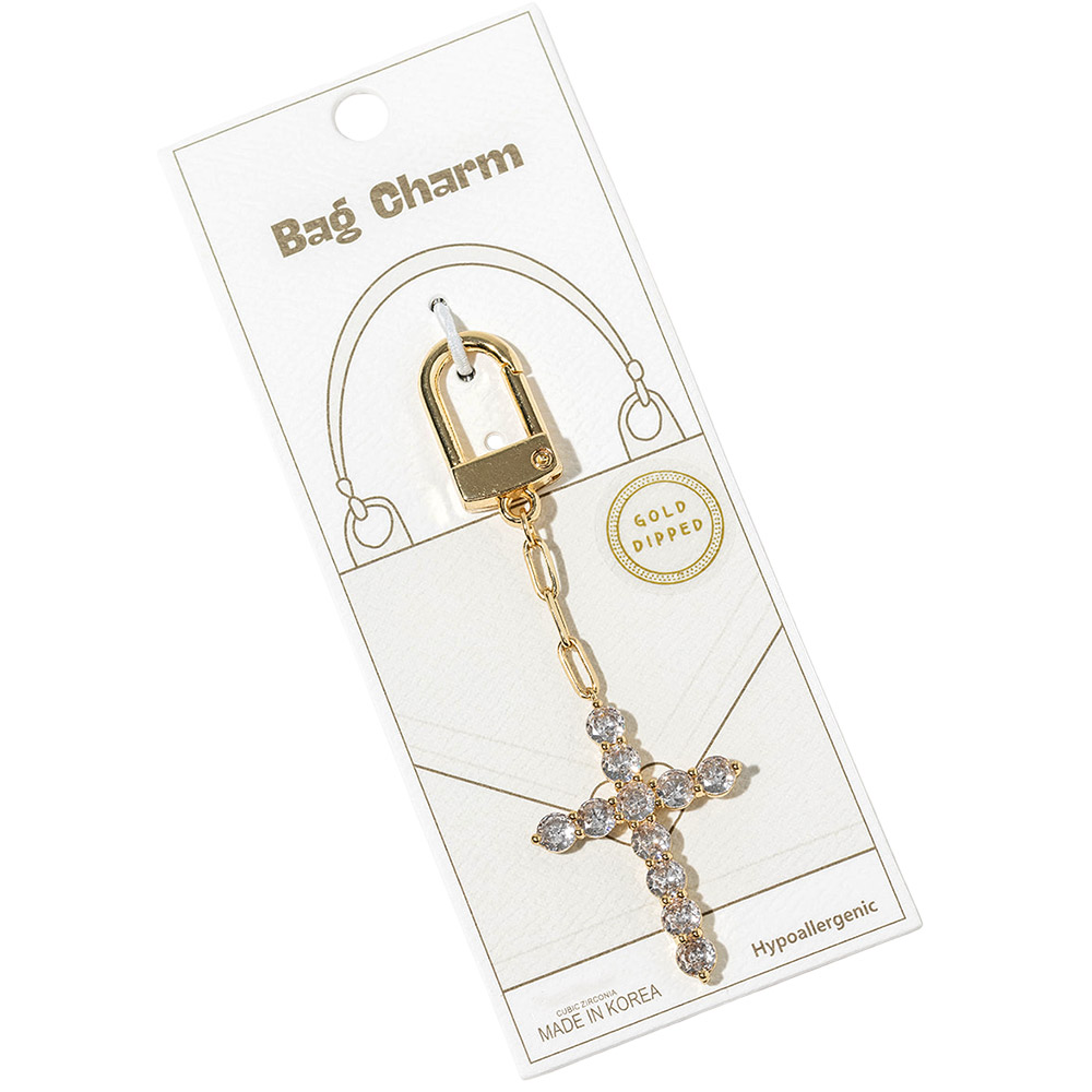 Details • Size : 336" L, 1.1" X 2.6" • Elegant cross bag charm keychain designed with sparkling crystal detailing for a timeless and meaningful statement. Easily clips onto handbags, totes, backpacks, or keys to add refined shine. A versatile accessory ideal for everyday styling, gifting, and boutique collections with symbolic appeal. • CZ Cubic Zirconia • Gold Dipped • Hypoallergenic • Lead and Nickel Compliant • Made In Korea