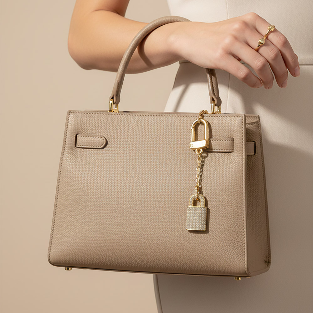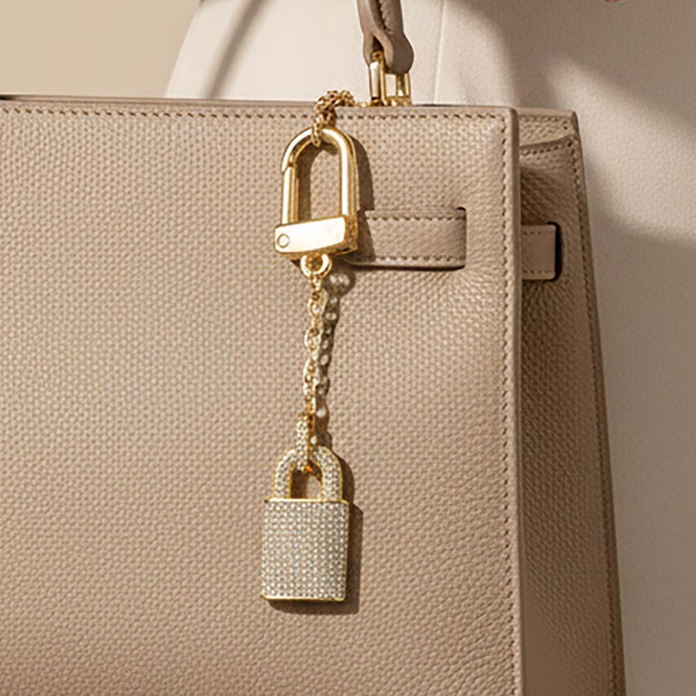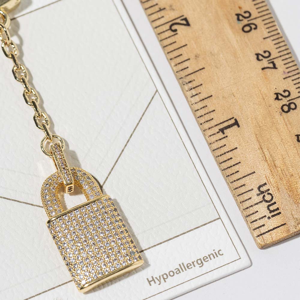 Details • Size : 3.4" L, 0.6" X 2.5" • Stylish padlock bag charm designed with sparkling crystal accents for a bold, modern statement. Clips easily onto handbags, totes, backpacks, or keys to add shine and personality. A chic accessory perfect for gifting, trend-driven displays, and boutique collections seeking eye-catching detail. • CZ Cubic Zirconia • Gold Dipped • Hypoallergenic • Lead and Nickel Compliant • Made In Korea