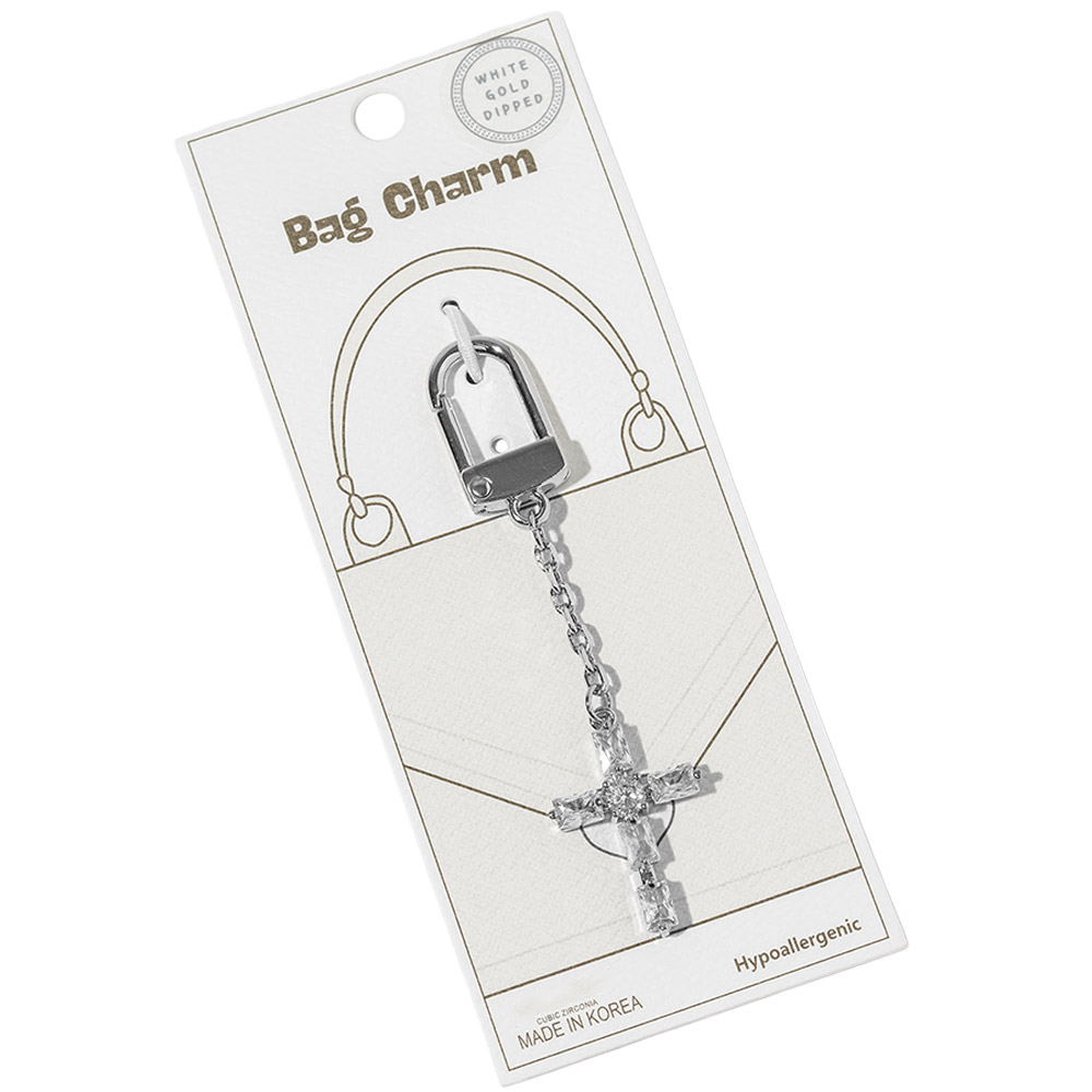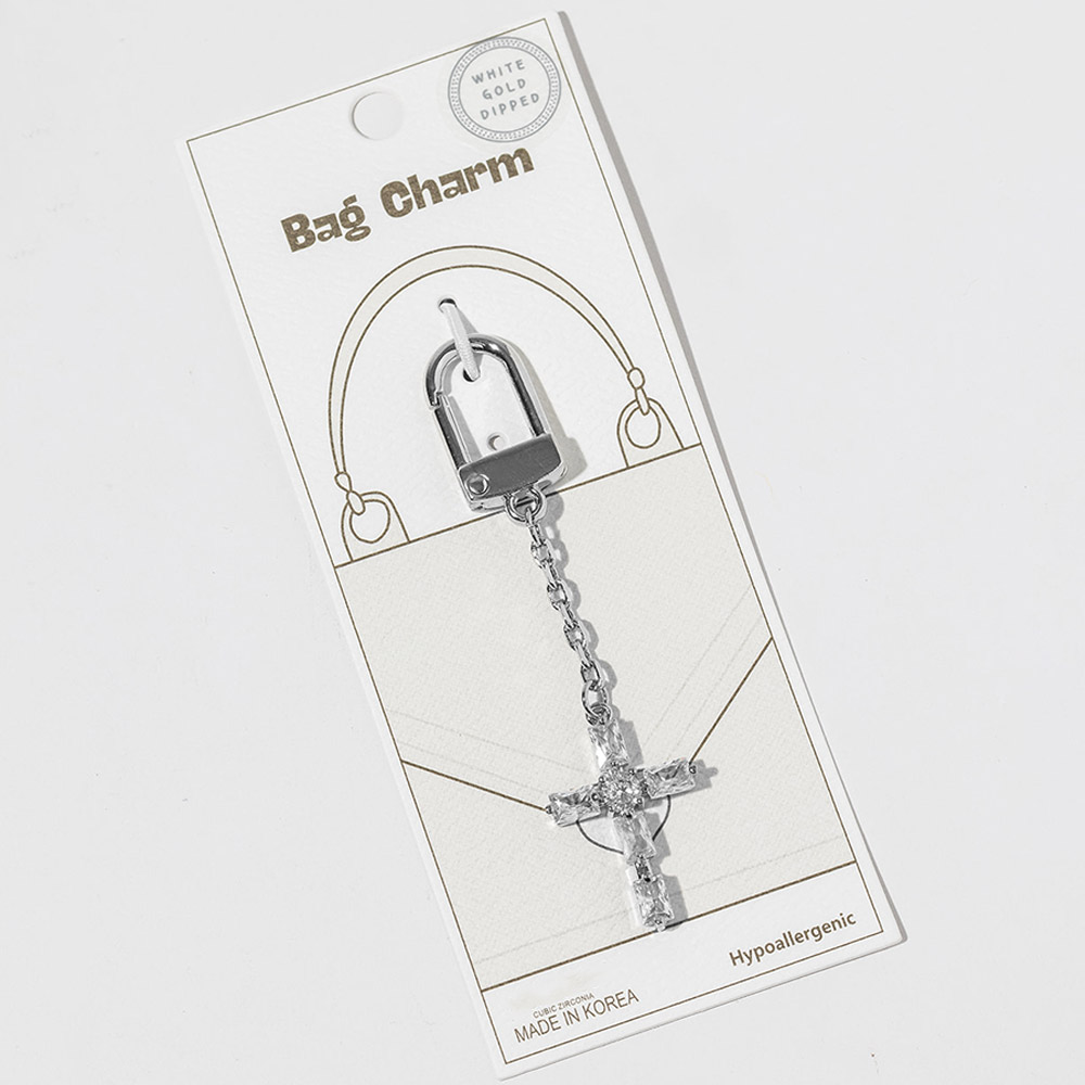 White Gold Dipped CZ Cross Drop Keychain Bag Charm