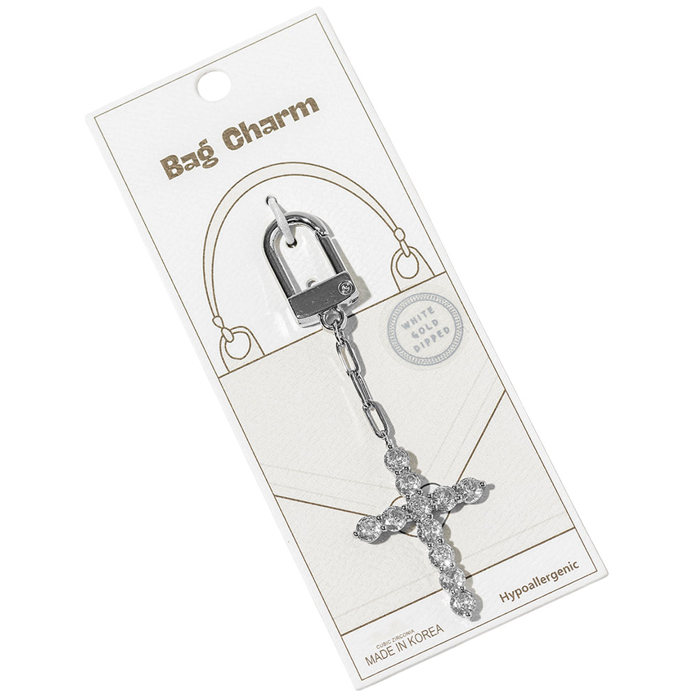 Details • Size : 336" L, 1.1" X 2.6" • Elegant cross bag charm keychain designed with sparkling crystal detailing for a timeless and meaningful statement. Easily clips onto handbags, totes, backpacks, or keys to add refined shine. A versatile accessory ideal for everyday styling, gifting, and boutique collections with symbolic appeal. • CZ Cubic Zirconia • Gold Dipped • Hypoallergenic • Lead and Nickel Compliant • Made In Korea