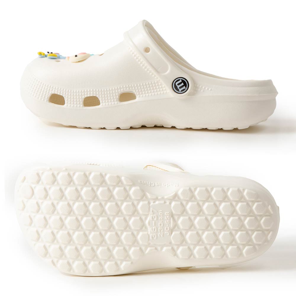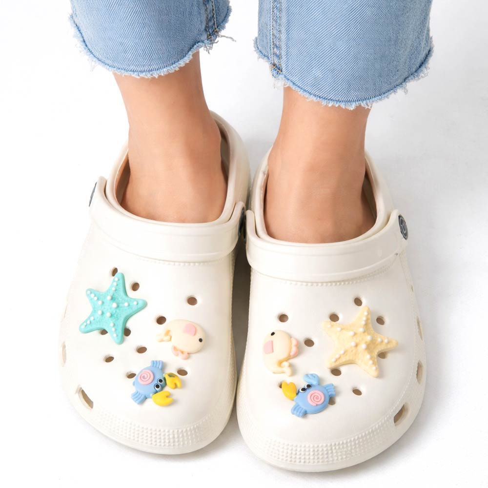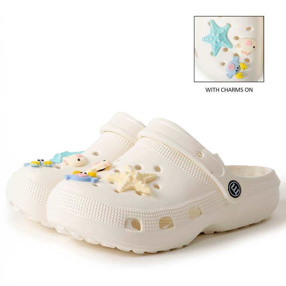 Details • Size : 6 Pairs Assorted size in each pack • Small, 2 Medium, 2 Large • S Size : US 6 ~ 7 (36-37) • M Size : US 8 ~ 9 (38-39) • L Size : US 10 ~ 14 (40-41) • Material : 100% EVA • Playful clog style footwear designed with fun decorative charms, breathable perforations, and a cushioned footbed for everyday comfort. Features a pivot heel strap for secure wear or easy slip-on styling, ideal for casual outings, travel, and relaxed daily looks.