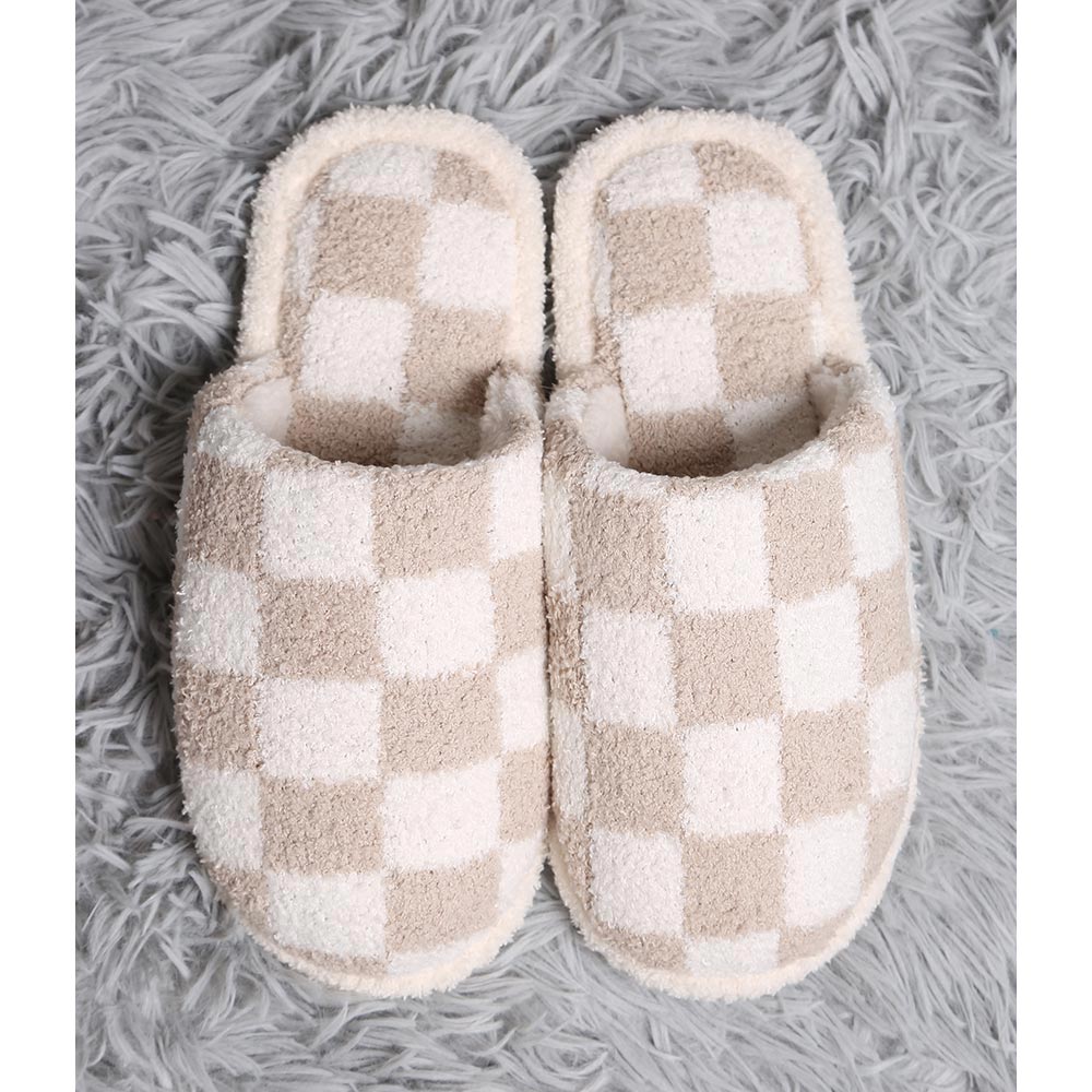 Details • Size : M/L (Women 8-10, Men 7-9) • Material : 100% Poly. Microfiber • Soft and stylish checkered indoor slippers in M/L size, perfect for lounging at home. Features a cushioned sole and slip-on design ideal for everyday relaxation and comfort indoors.