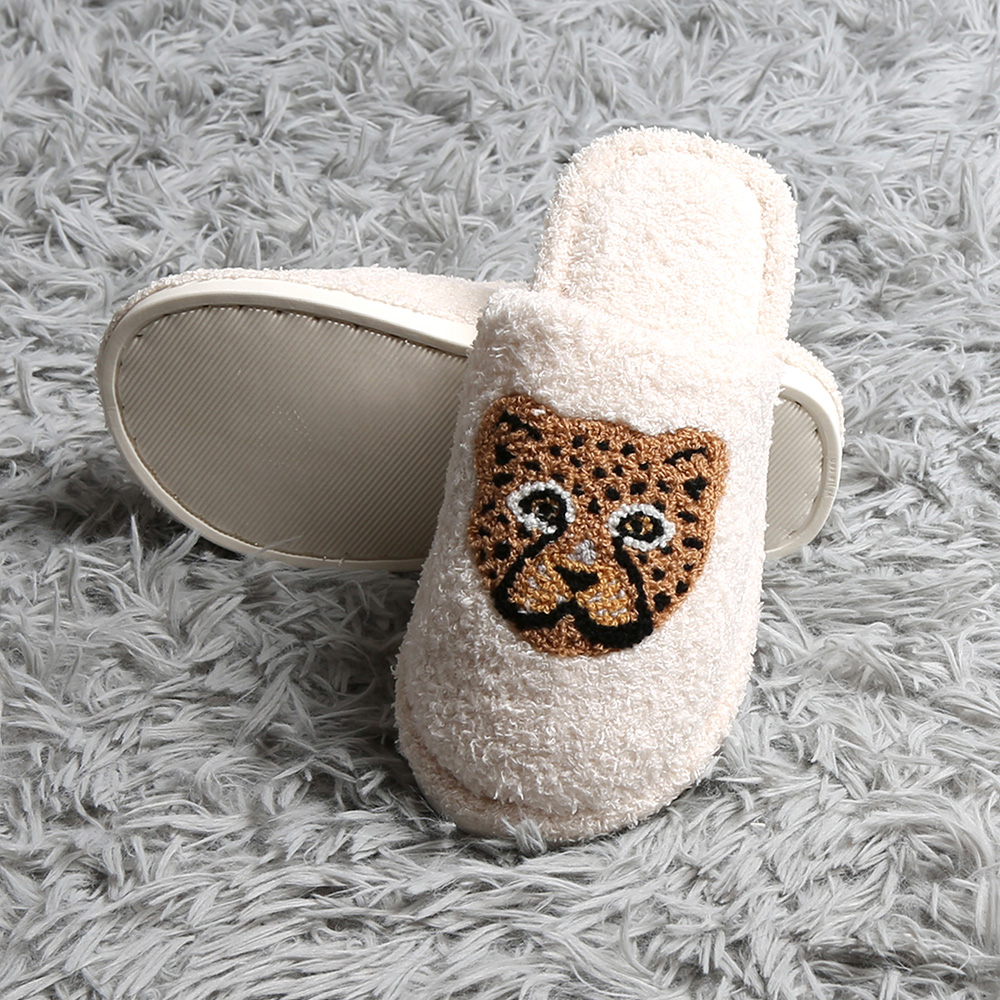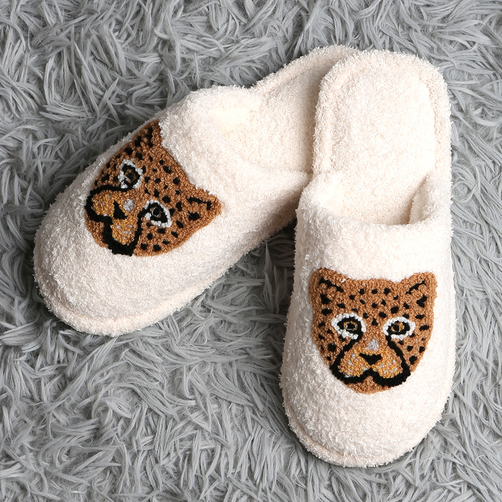 Details • Size : M/L (Women 8-10, Men 7-9) • Material : 100% Poly. Microfiber • Step into comfort with these cozy indoor slippers featuring a playful leopard face embroidery. Designed for softness and warmth, they add a fun animal-themed touch to your lounging routine, making them a perfect everyday essential or gift.