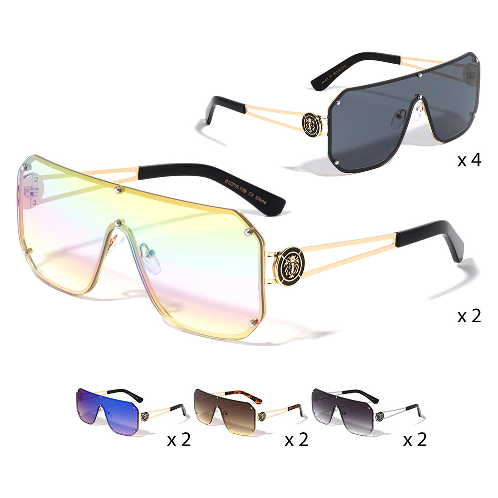• Oversized shield fashion sunglasses multipack designed for bold statement styling and high resale appeal. Features modern wrap inspired silhouettes with a comfortable fit for everyday wear. Ideal for trend driven outfits, travel looks, or festival styling, this assorted set delivers standout impact, versatility, and strong visual value in one curated accessory collection.