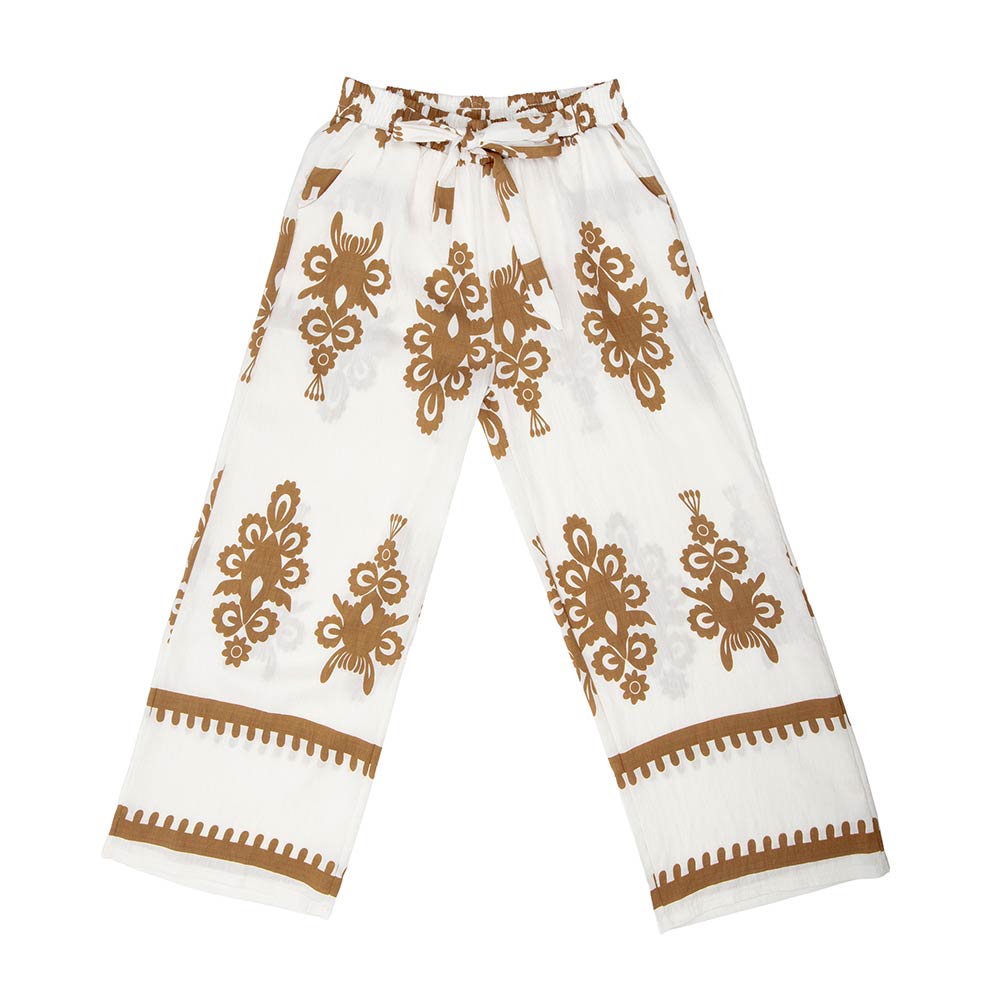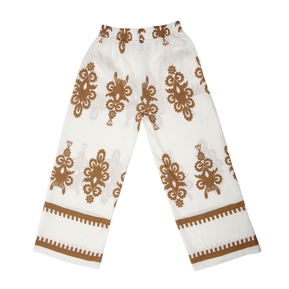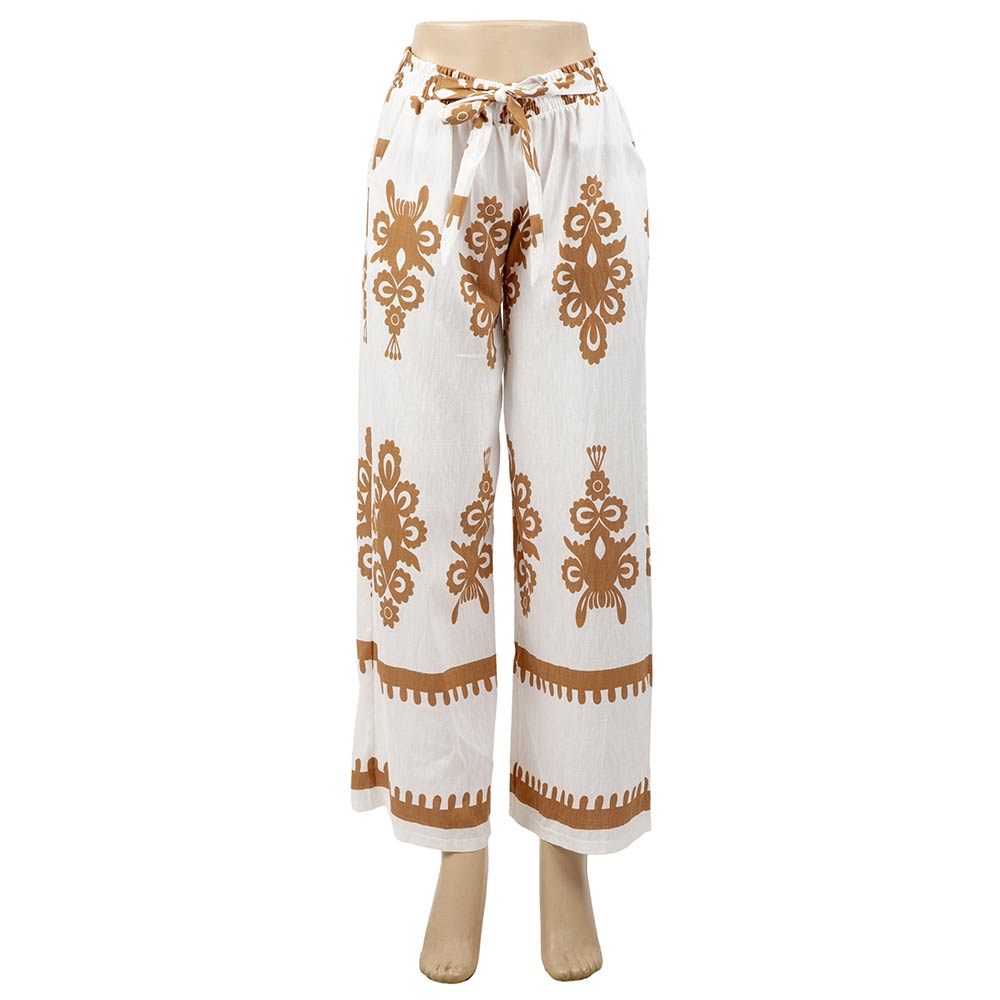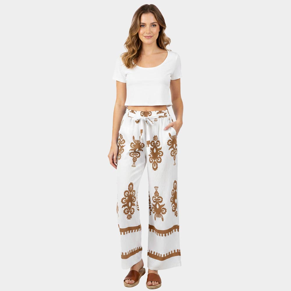 • Flowy wide leg pants designed with an ornate allover print and an easy elastic waistband for comfortable pull-on wear. The relaxed silhouette creates a flattering drape with effortless movement, making these pants ideal for everyday styling, resort looks, or boutique collections. A versatile statement piece that pairs easily with simple tops, sandals, or layered outfits for casual to elevated wear.