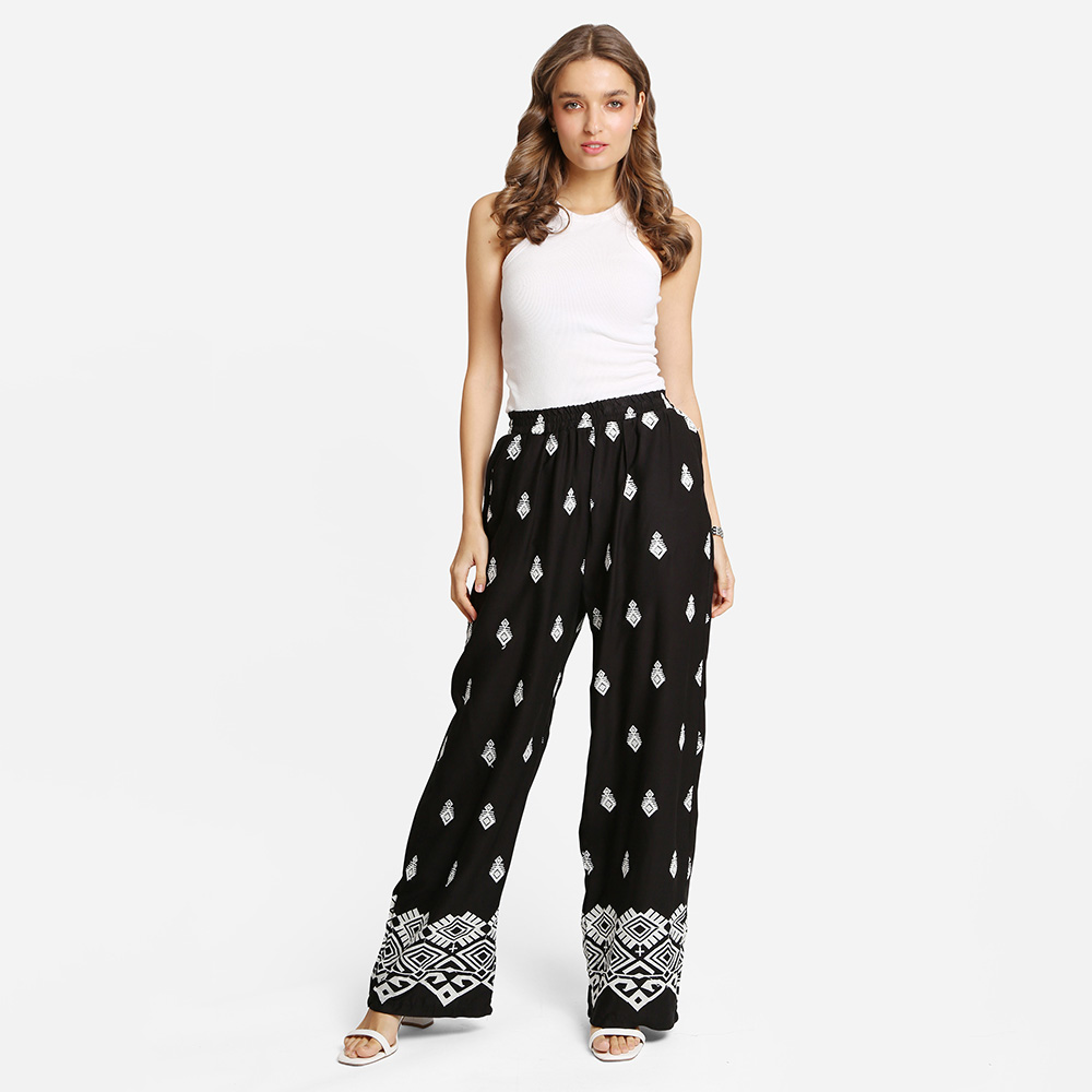 Boho Geometric Pattern Embroidered Wide Leg Pants