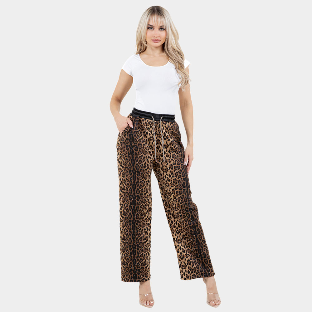 Details • Size : Plus Size • Material : 100% Polyester • Chic leopard print wide leg pants featuring a comfortable drawstring waist, relaxed full-length fit, and functional side pockets. A bold statement bottom perfect for casual outings or dressed-up looks, offering effortless style and everyday wearability.