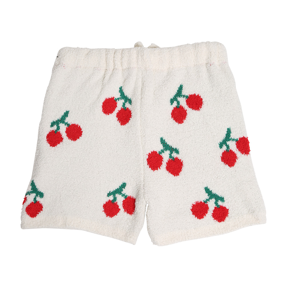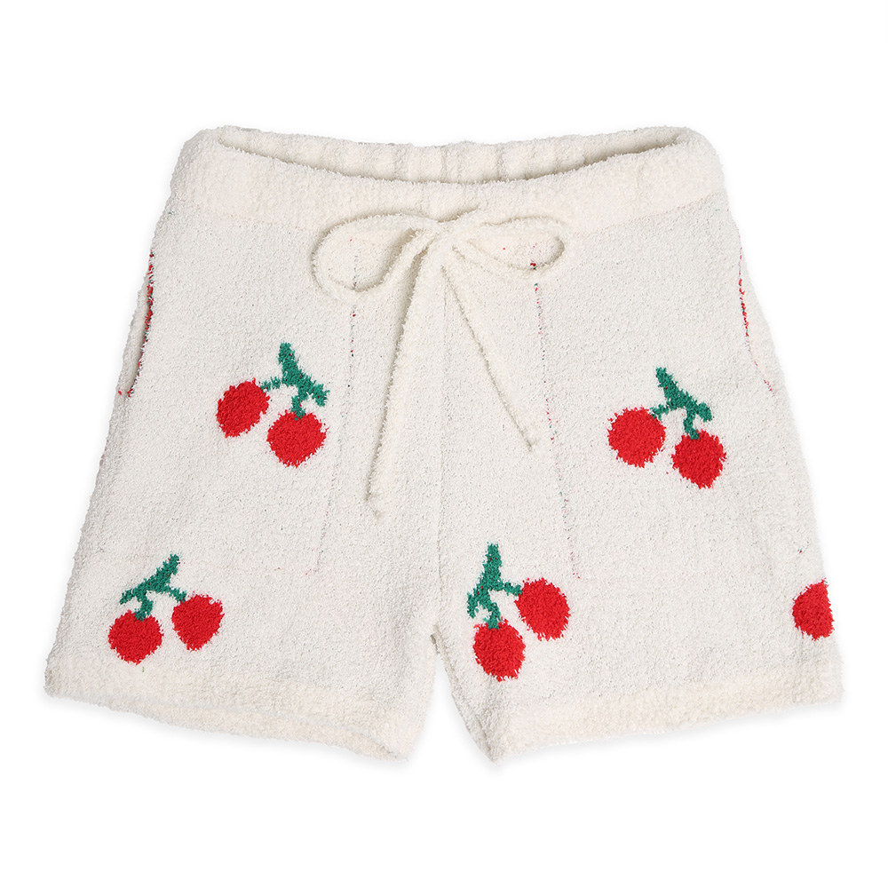 Details • Size : S/M • Material : 100% Poly.Microfiber • Add a fun twist to your loungewear with these drawstring lounge shorts featuring an allover cherry pattern. Crafted for softness and comfort, they offer a relaxed fit that’s perfect for casual days, lounging at home, or pairing with your favorite cozy tops.