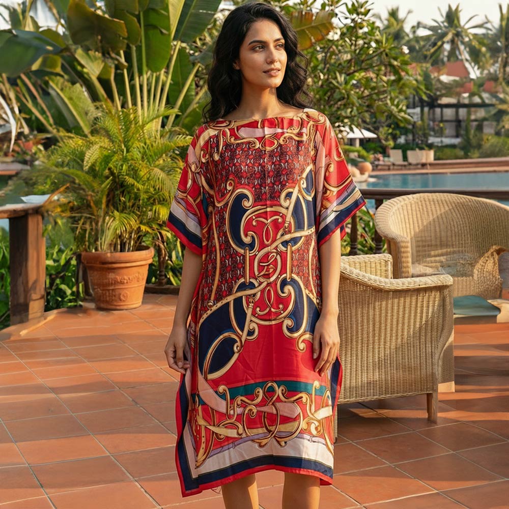 Details • Size : 35" X 36" • Material : 70% Viscose, 30% Silk • This kaftan midi dress features a flowing silhouette with an elegant allover print that drapes effortlessly for relaxed yet polished styling. Designed for comfort and versatility, it transitions easily from resort wear to casual outings. Ideal for boutiques seeking statement dresses with easy fit appeal, timeless shape, and elevated everyday wear potential.
