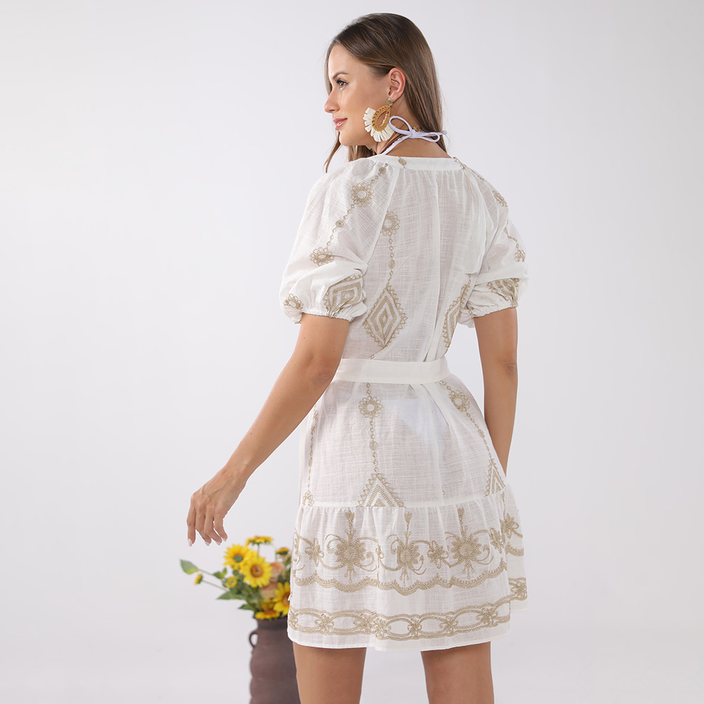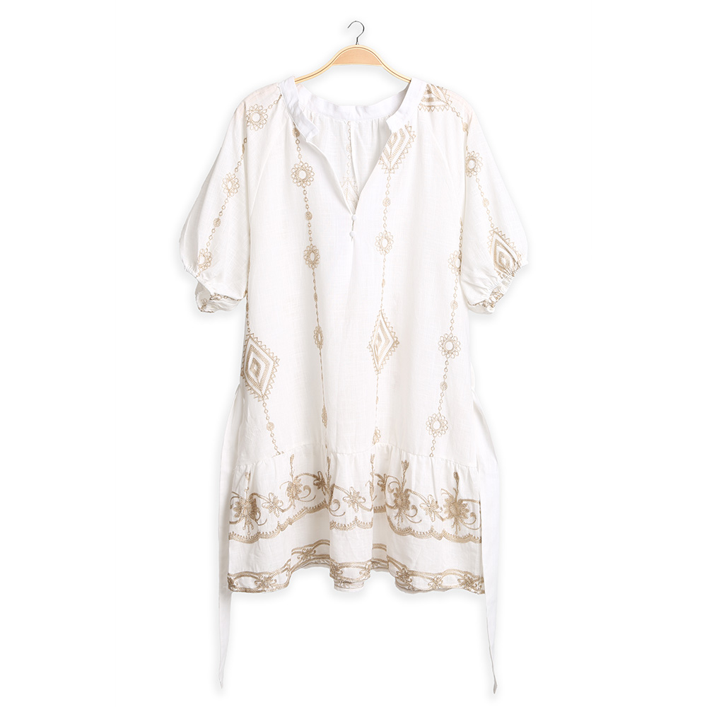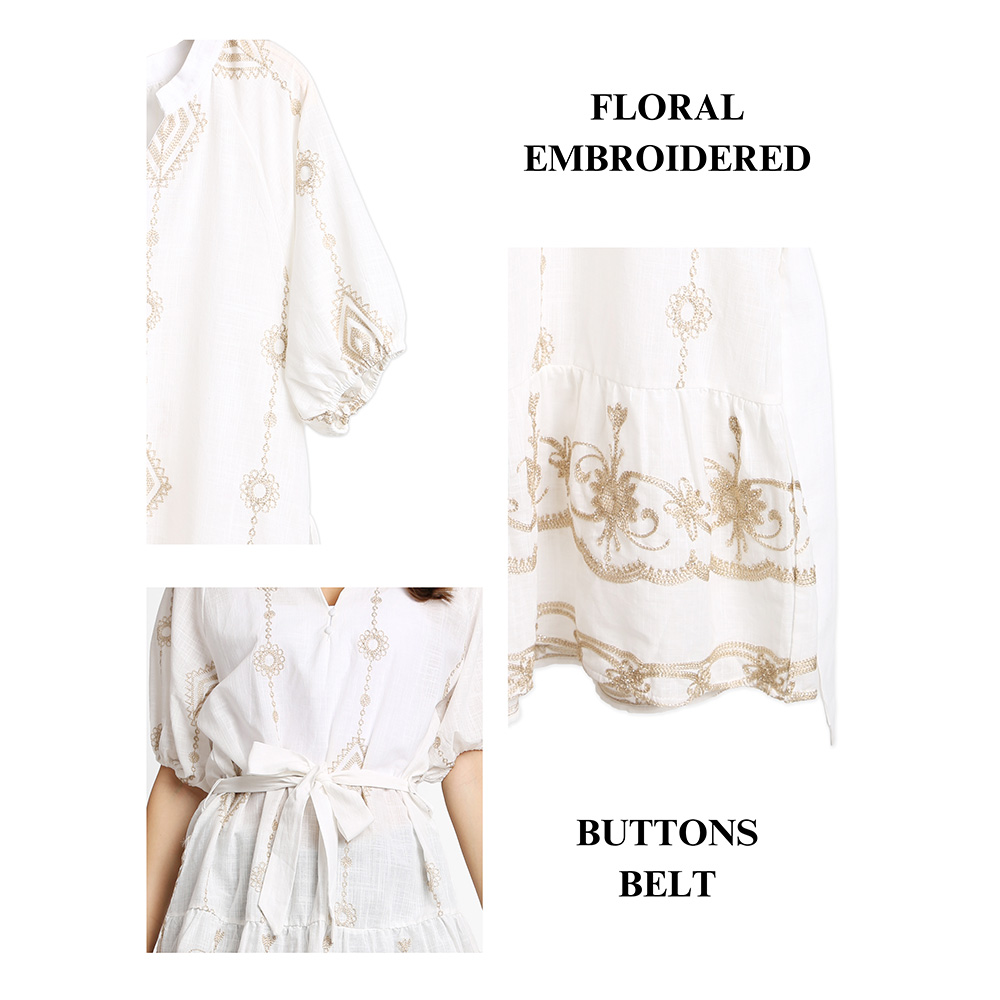 Details • Size : One Size • Material : 50% Cotton, 50% Viscose • Vintage-inspired intricate embroidery details add charm and elegance • Comfortable, breathable fabric perfect for warm days • Puff sleeves and ruffle hem add feminine touch • Versatile boho style : Wear it as a tunic, a dress, or a chic vacation cover-up • Features a relaxed cut for ultimate comfort and effortless styling