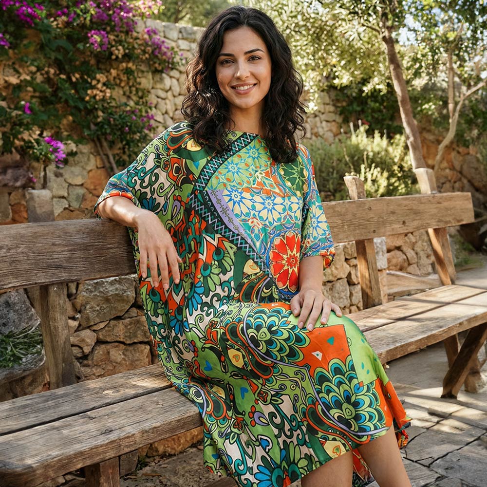 Bold Bohemian Patchwork Print Resort Silky Kaftan Midi Dress
