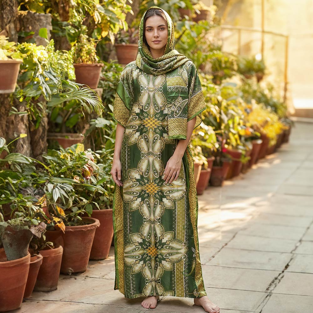 Elegant Print Resort Silky Kaftan Maxi Dress