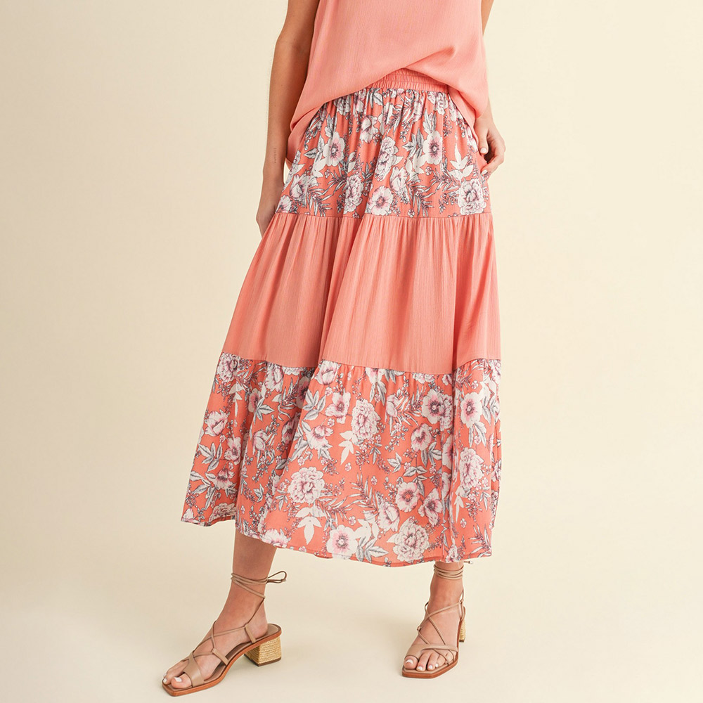Details • Size : Large • Introducing our Dream Floral skirt, a delightful addition to your wardrobe. Crafted with a gentle salmon hue and adorned with vibrant floral patterns, this skirt effortlessly embodies elegance and femininity. Its lightweight and flowy fabric ensure graceful movement with every step, while the elastic waistband offers comfort and versatility in fit. Perfect for Summer/ Spring! • Lightweight • Floral • Flowy • Touches at the waist • Elastic band • Ankle length • Imported • Material : 100% Rayon