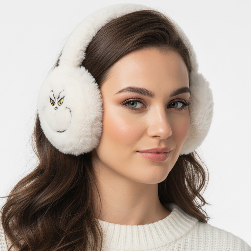 Details • Size : One Size • Stay warm and playful this winter with these plush earmuffs featuring an embroidered grinning face design. Their ultra-soft texture and whimsical charm make them perfect for adding personality to cold-weather outfits while keeping your ears cozy and comfortable.