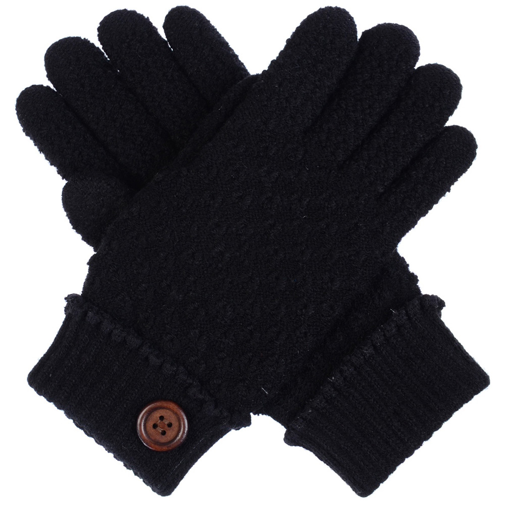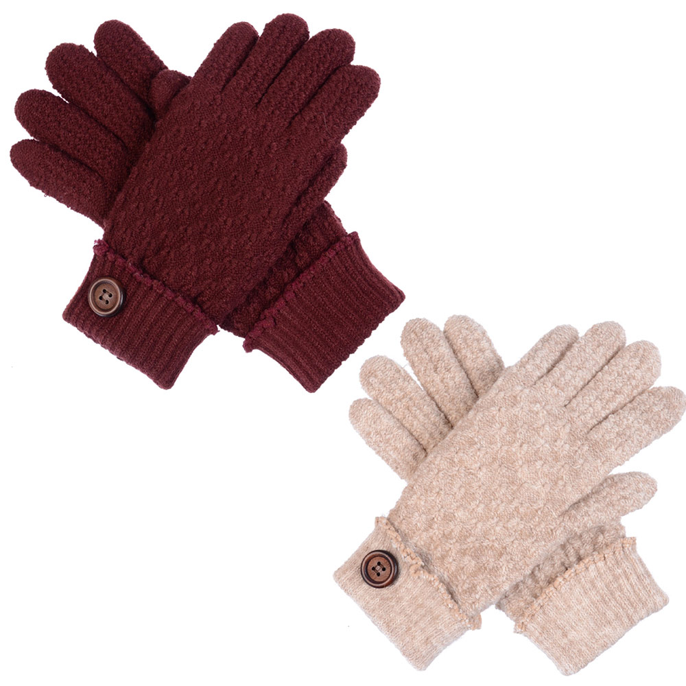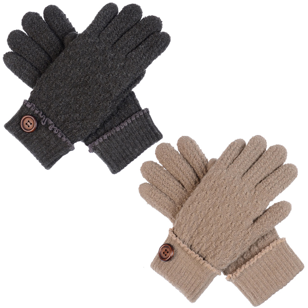 Details • Size : One size • Material : 80% Acrylic, 20% Nylon • Lining : 100% Nylon • 2 pcs each color shown • Warm knit gloves featuring a textured finish, ribbed cuffs, and a decorative button accent for a stylish touch. Perfect for everyday wear during chilly weather, these cozy gloves combine comfort, function, and charm to complement any casual or dressy winter outfit.