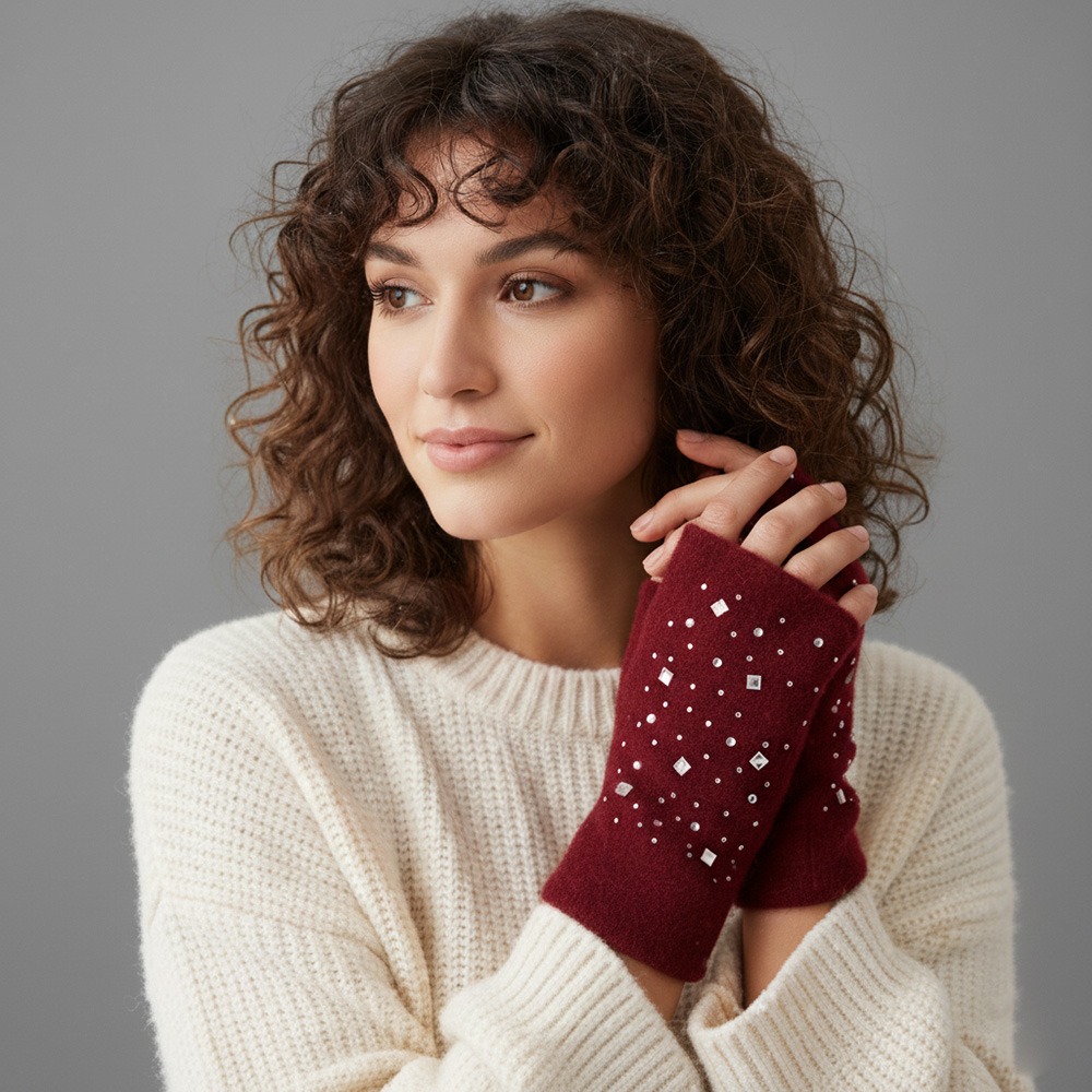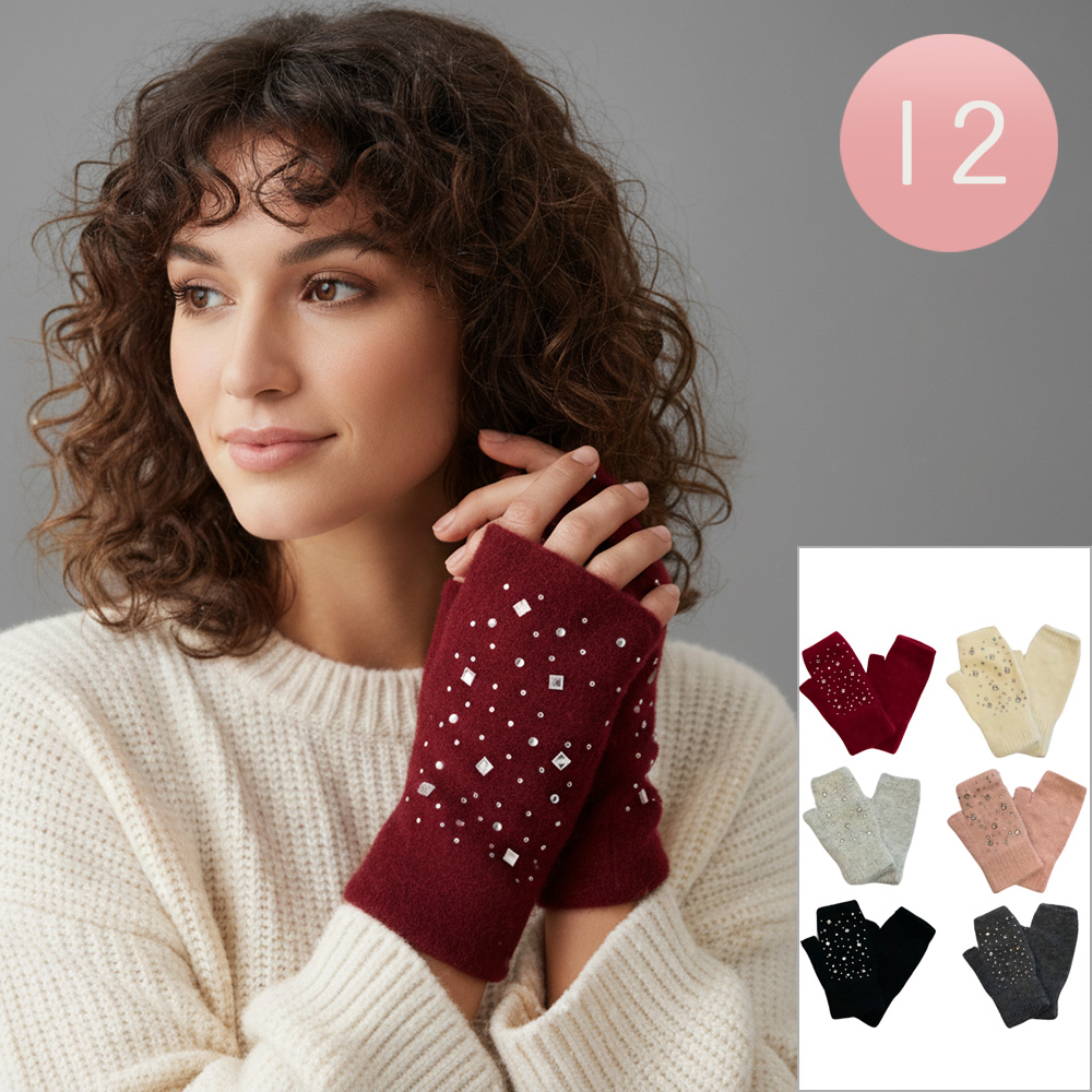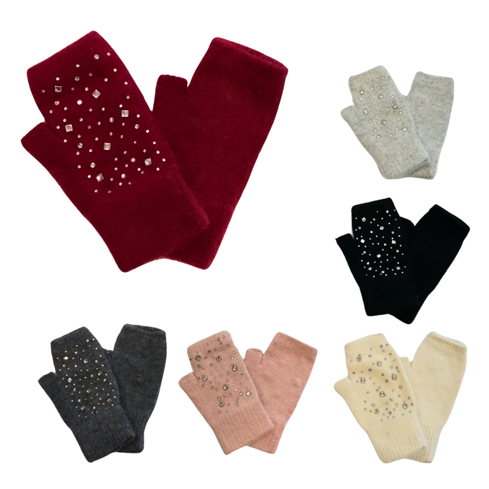 Details • Size : One Size • Material : 30% Angora, 55% Acrylic, 15% Wool • 4pairs BLACK / 2pairs IVORY / 2paris PINK / 2Pairs LIGHT GREY /1Pair BURGUNDY / 1Pair DARK GREY • Add sparkle to your winter look with these embellished fingerless knit gloves. Designed for warmth and style, they feature rhinestone details and a soft knit construction. Perfect for keeping hands cozy while allowing easy phone use, writing, or everyday tasks in cold weather.