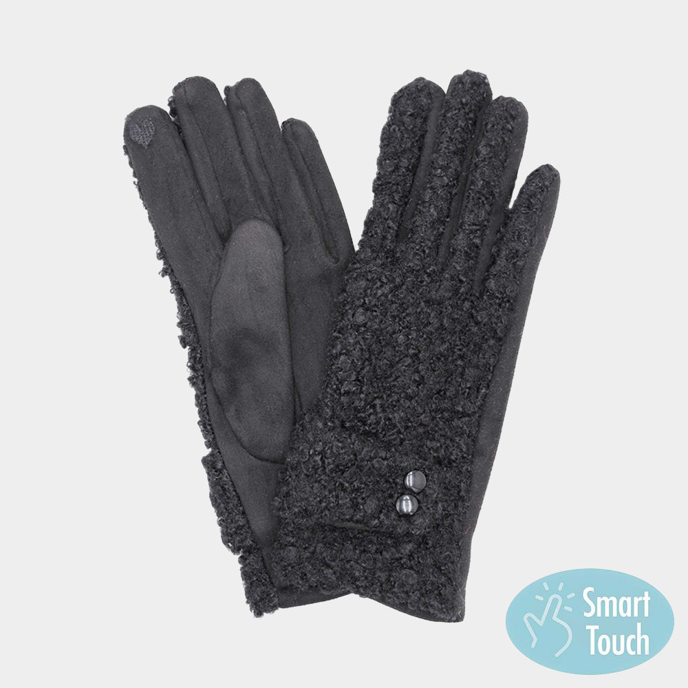 • Cozy gloves designed with a boucle textured finish and button accent, complete with smart touch fingertips for phone use. Stylish yet practical, these gloves provide warmth and comfort while keeping everyday looks polished in cold weather.