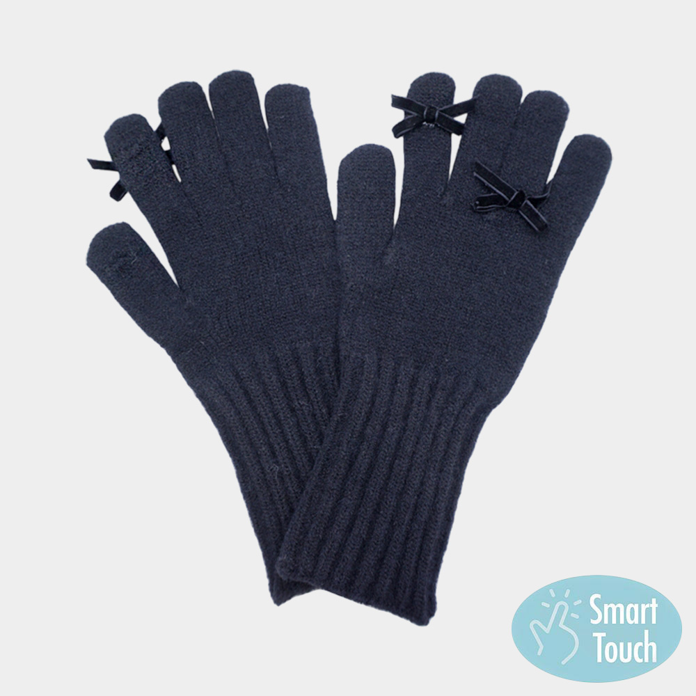 Details • Size : One Size • Material : 100% Polyester • Smart Touch • Chic knit gloves with ribbed cuffs and charming bow accents, designed with smart touch technology for easy phone and tablet use. A stylish blend of warmth and functionality, these winter gloves add a feminine touch to cold-weather outfits while ensuring comfort and everyday practicality.