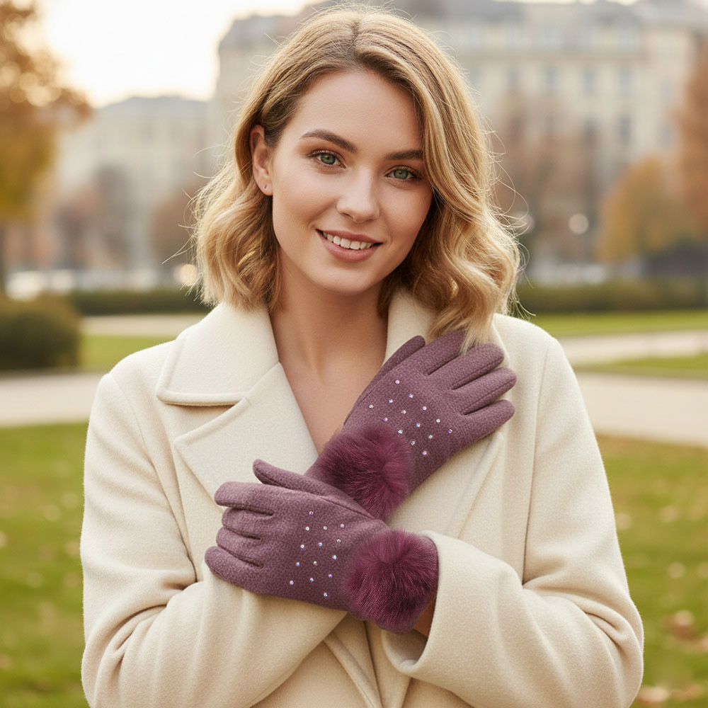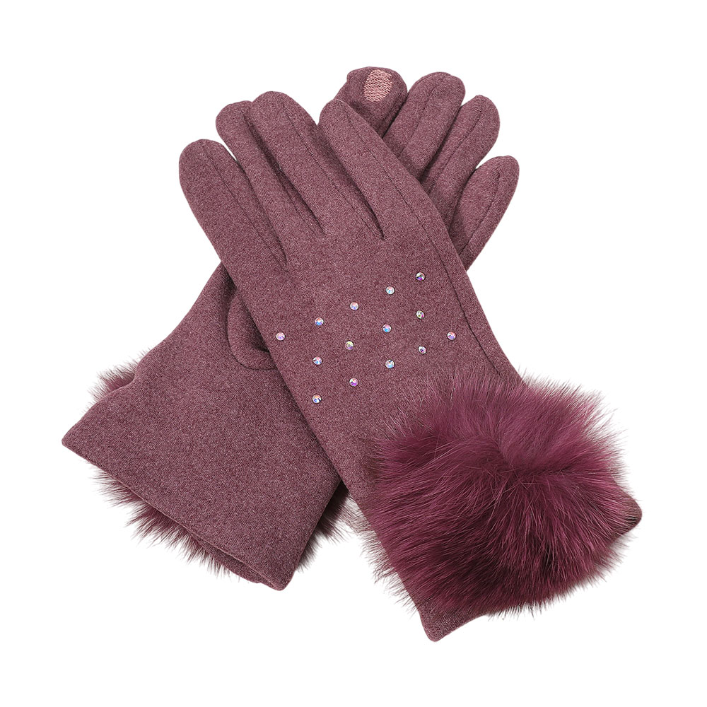 • Elegant smart touch gloves featuring faux fur cuff poms and sparkling rhinestone accents. Designed for warmth and convenience, these chic gloves allow touchscreen use while adding a touch of sophistication to any outfit, perfect for stylish cold-weather wear and everyday elegance.