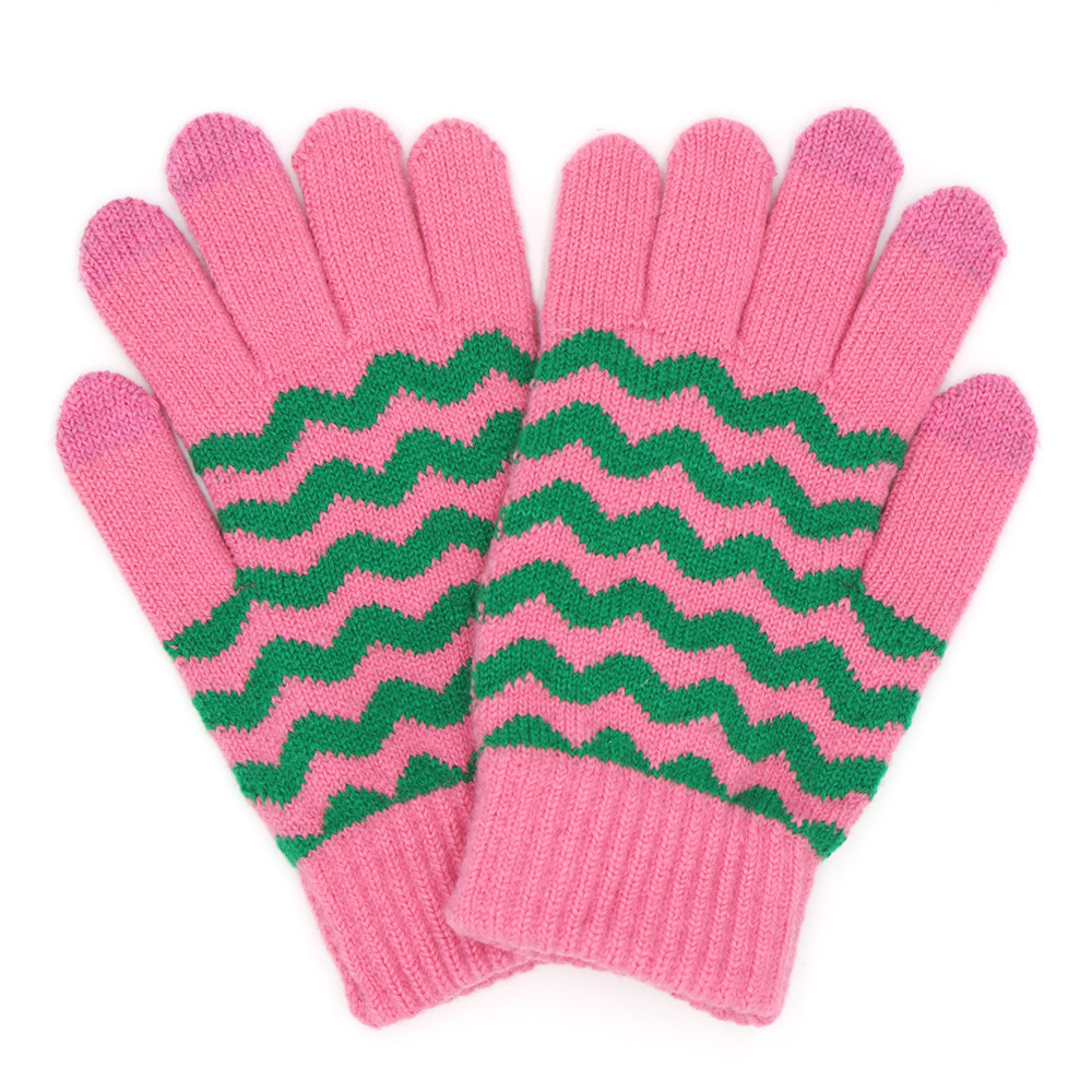 Details • Size : One Size • Material : 70% Polyester, 30% Wool • Smart Touch • Cozy knit touchscreen gloves with a bold wave pattern, perfect for winter days. Enjoy full mobile device use while keeping your hands warm and stylish with these functional and comfortable gloves.