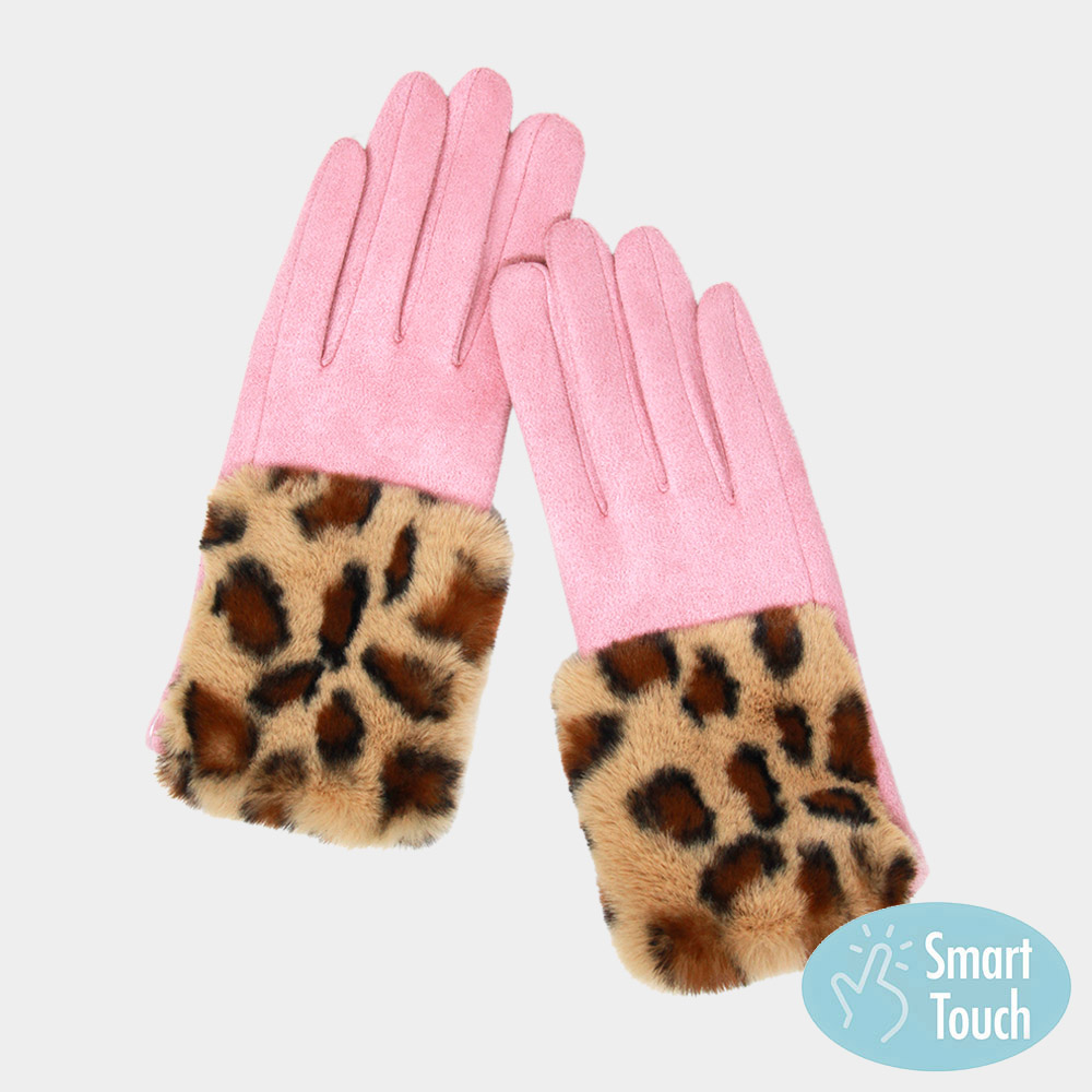 Leopard Patterned Faux Fur Cuff Accented Soft Suede Smart Gloves