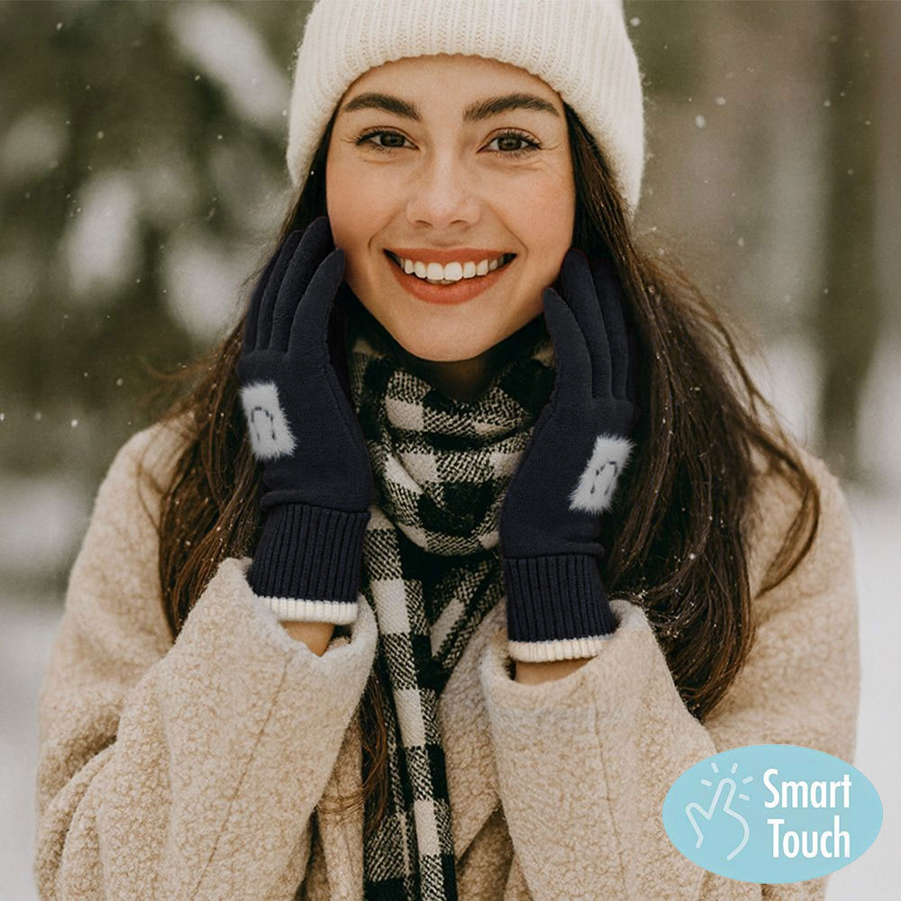 • Cozy knit gloves with smart touch technology, featuring a playful face motif and contrast trim design. Perfect for keeping hands warm while allowing easy use of smartphones and tablets. A stylish and practical cold-weather accessory that combines fun detailing with everyday functionality.