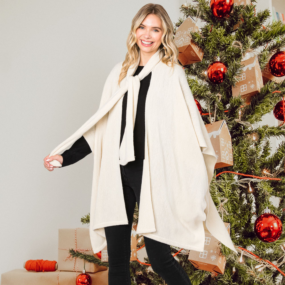 Details • Size : 37.5" X 63" • Material : 100% Acrylic • Stylish poncho wrap featuring an open front and matching scarf for added warmth and flair. Designed with a relaxed drape for comfort and elegance, this layering piece transitions seamlessly from casual to elevated looks.