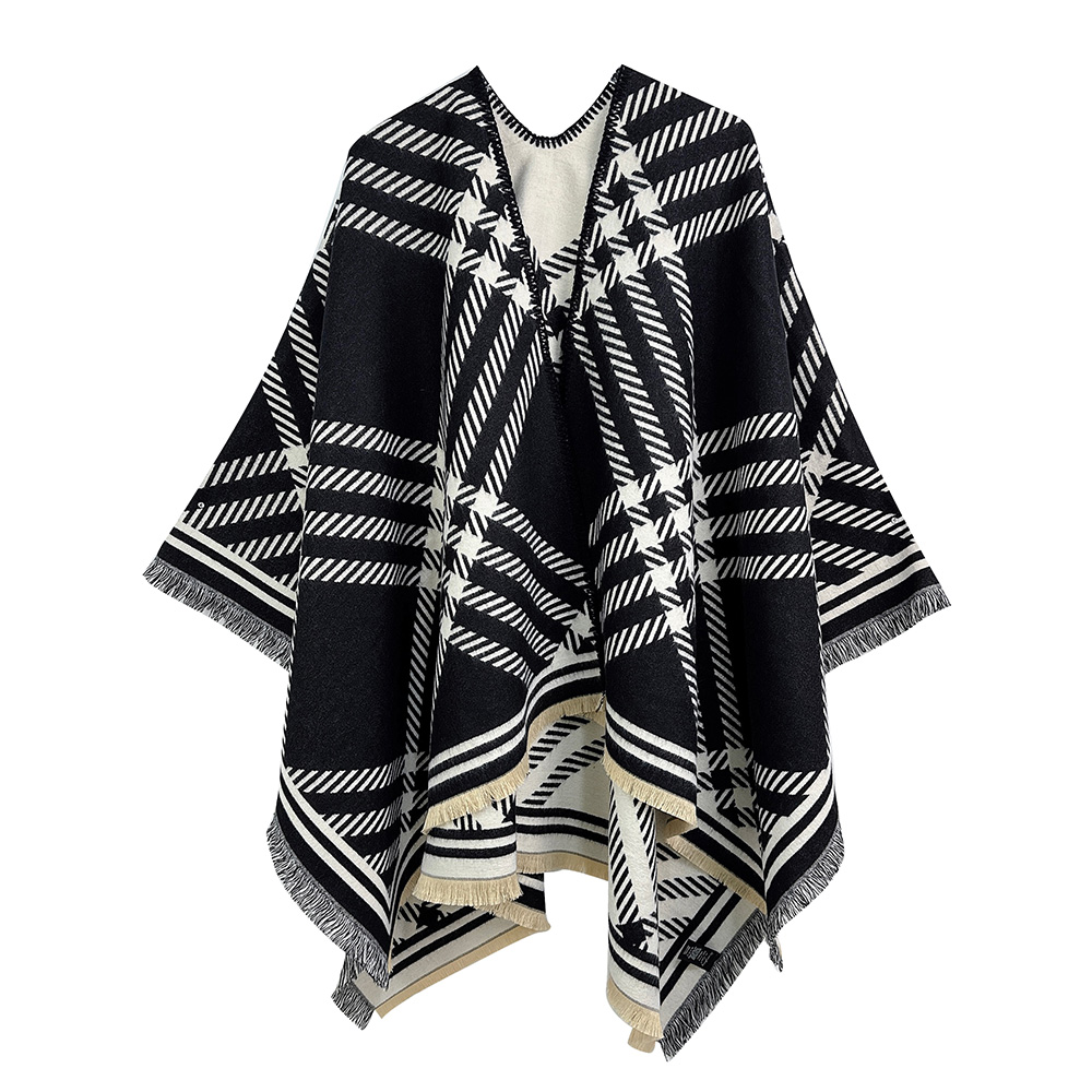 • Stay effortlessly stylish with this geometric pattern poncho featuring a timeless design and fringed hem. Its draped silhouette and modern detailing make it a versatile layering piece, adding refined charm and cozy elegance to both casual and chic ensembles.