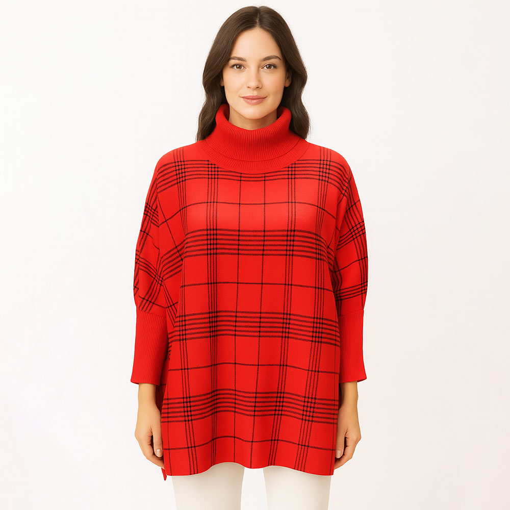 Details • Size : 47" X 30" • Material : 100% Acrylic • Turtleneck poncho sweater with a clean checked pattern, relaxed draped fit, and long ribbed sleeves. A stylish and comfortable layering piece designed for everyday wear, offering a modern look with a soft, easy silhouette.
