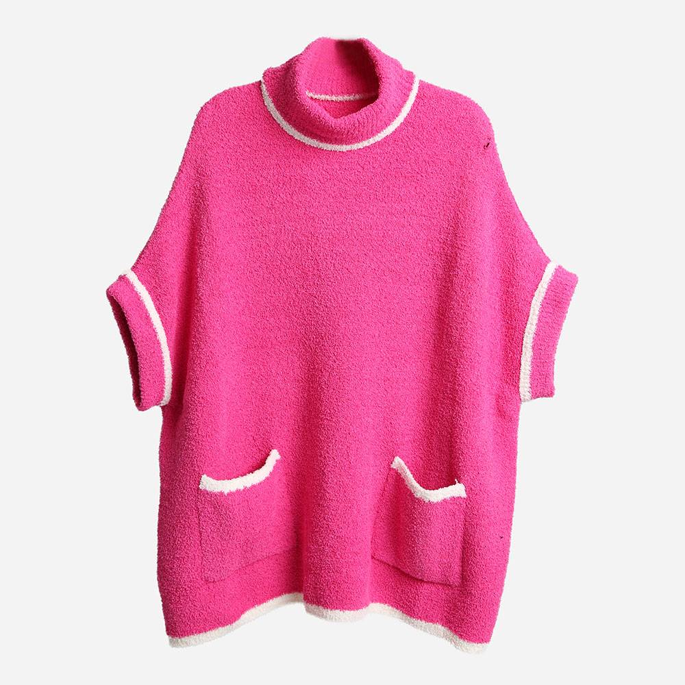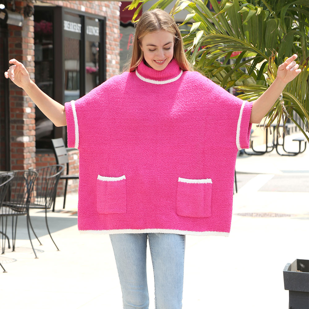 • Elevate your wardrobe with this cozy textured poncho featuring a relaxed turtleneck, short sleeves, and front pockets for style and convenience. Perfect for layering, it offers comfort and effortless chic appeal for casual days or cool-weather outings.