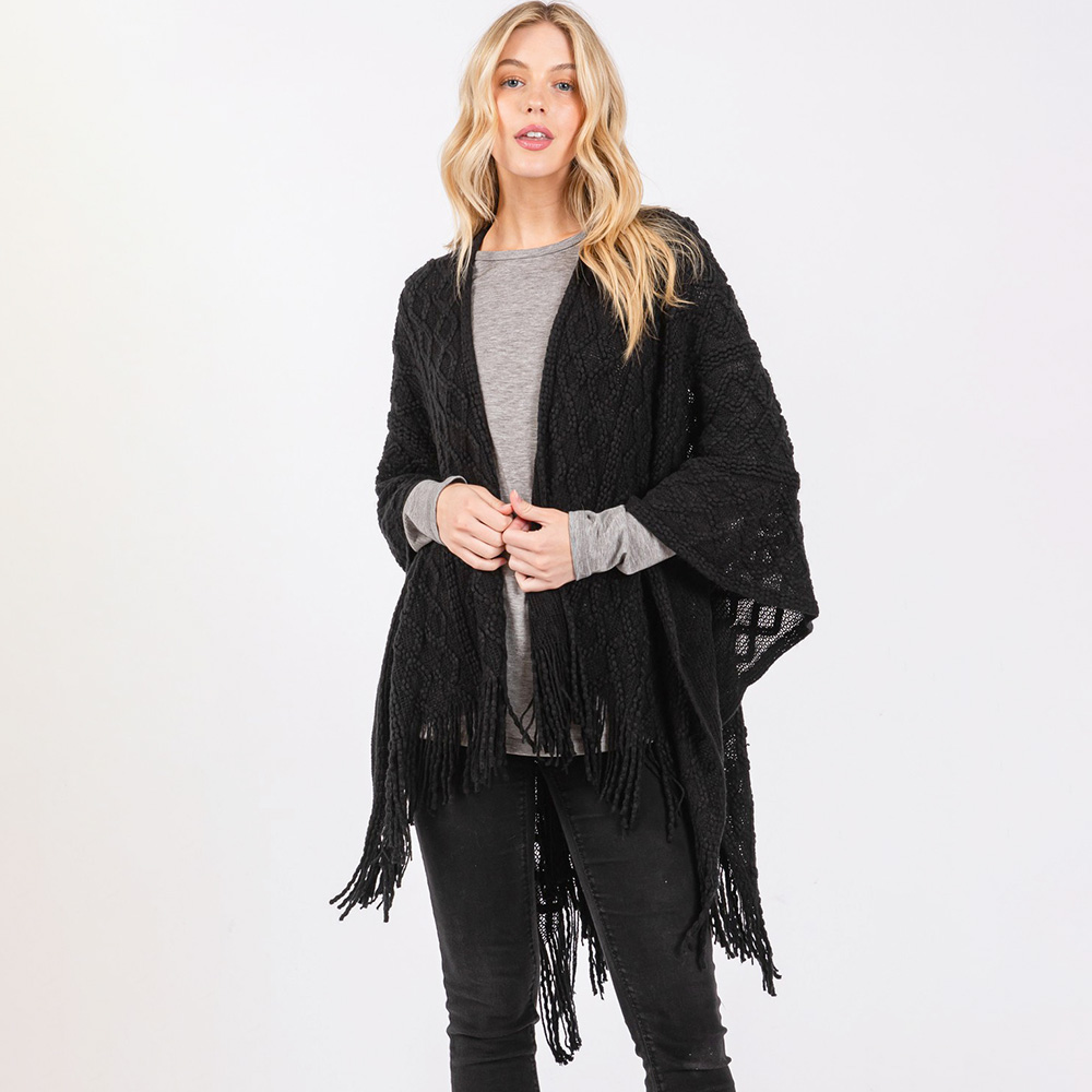 Diamond Pattern Tassel Knit Ruana Poncho