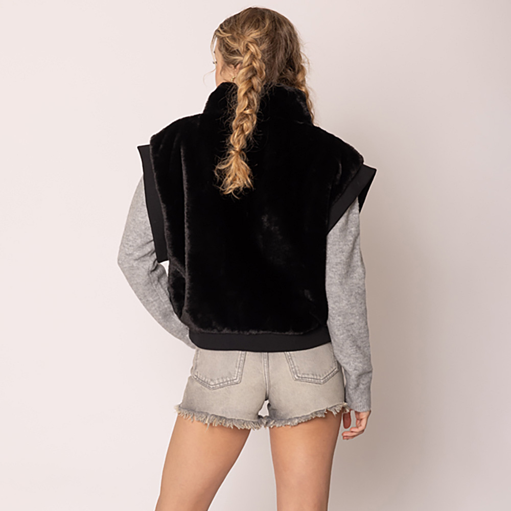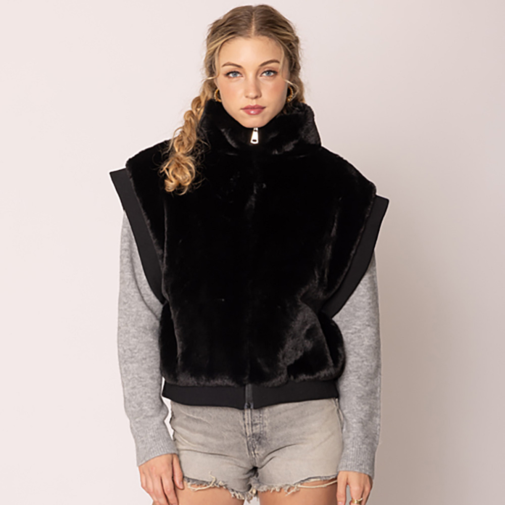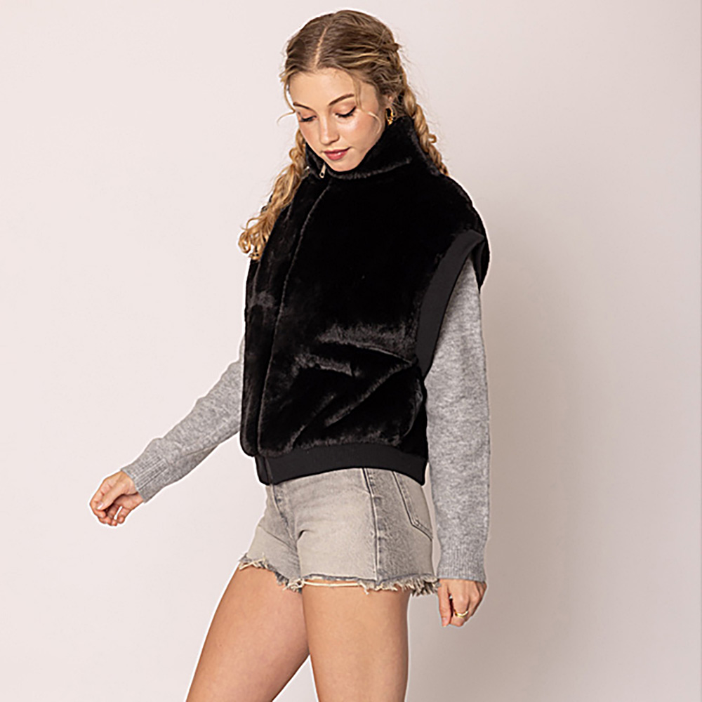 Details • Size : 22" X 21.7" • Material : 100% Polyester • Stay cozy and chic in this sleeveless faux fur vest with a full zipper front and high collar. Perfect for layering over sweaters or tops, it adds warmth and modern elegance to casual and dressy looks. A versatile outerwear piece designed for style and comfort in any season.