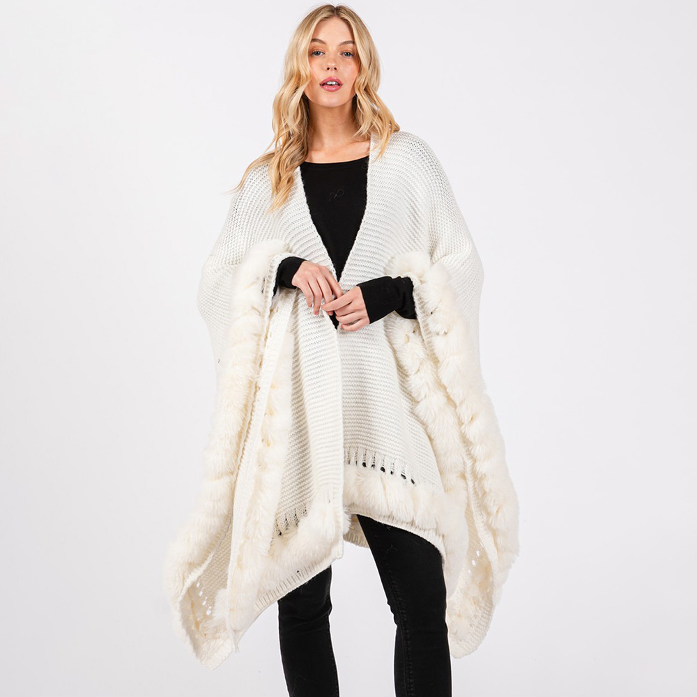 Details • Size : 27.5" X 37" • Material : 80% Acrylic, 20% Polyester • Luxurious knit poncho cape with a plush faux fur trim, offering a cozy yet polished look for chilly days. Its flowing silhouette and textured design provide effortless layering for both casual and dressed-up outfits.