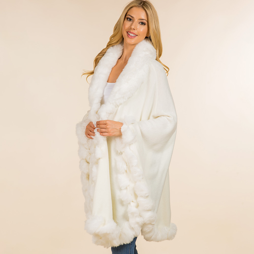 Details • Size : One Size • Material : 100% Acrylic • Elegant cape featuring plush faux fur trim and a flowing open design that combines warmth with timeless style. Perfect for layering over casual or formal outfits, this versatile piece adds a touch of sophistication and comfort to any wardrobe.