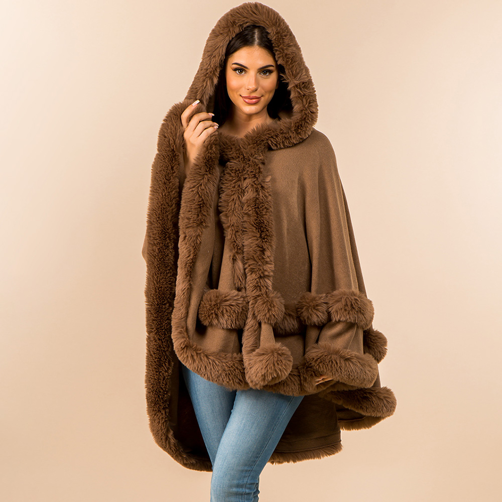 Faux Fur Trim Hooded Elegant Drape Cape Poncho Faux Fur Trim Hooded Elegant Drape Cape Poncho Faux Fur Trim Hooded Elegant Drape Cape Poncho