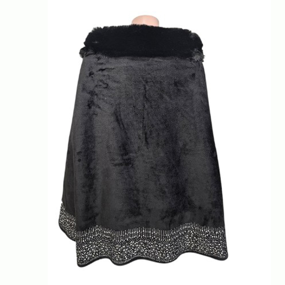 Faux Fur Trim Rhinestone Embellished Hem Poncho Shawl